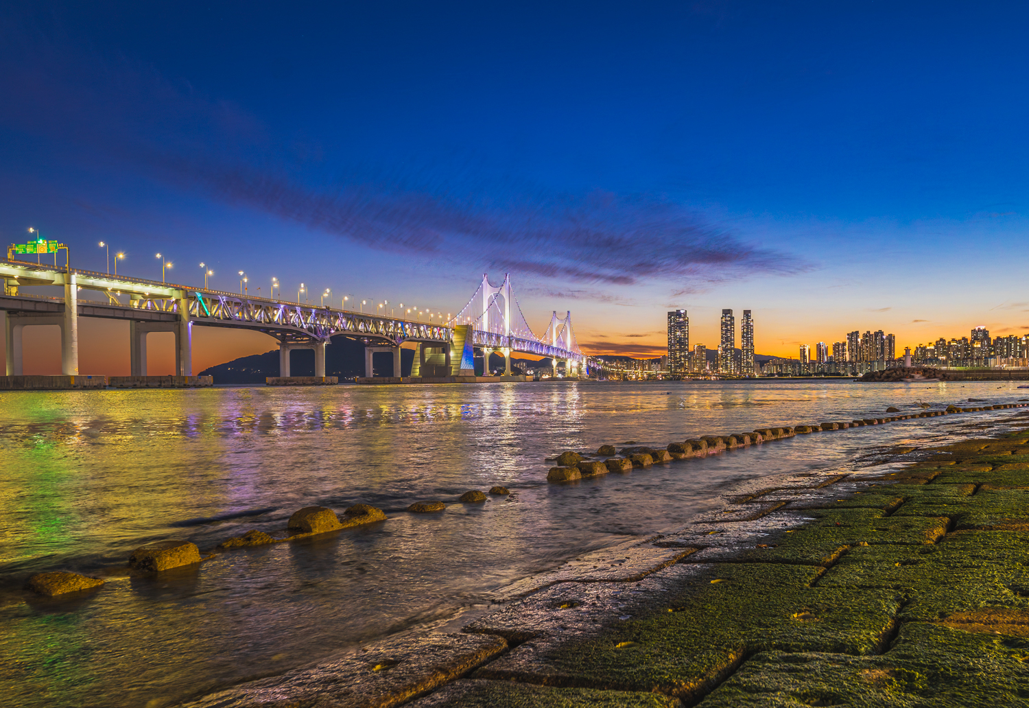 민락수변공원에서 광안대교와 뒤쪽으로 보이는 남천동의 야경을 일몰시간에 담아보았습니다.