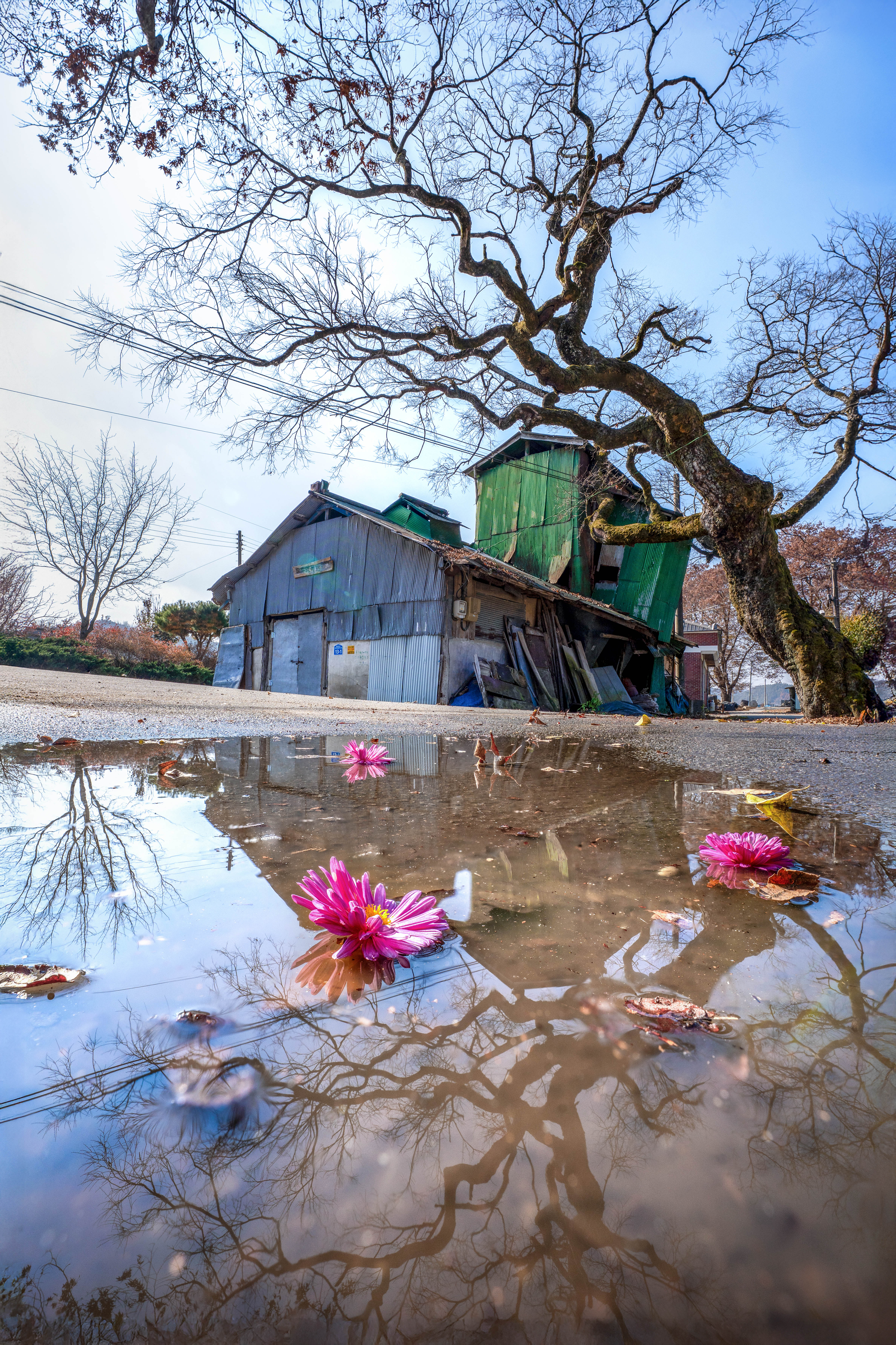 시골 정미소앞에서 고여있는 물에 꽃잎을 뛰워 가는 가을의 아쉬움을 표현했습니다~ 포커스스테킹 기법을 이용해 20여장의 사진을 찍어 전경부터 후경까지 선명한 사진을 만들어 보았습니다~