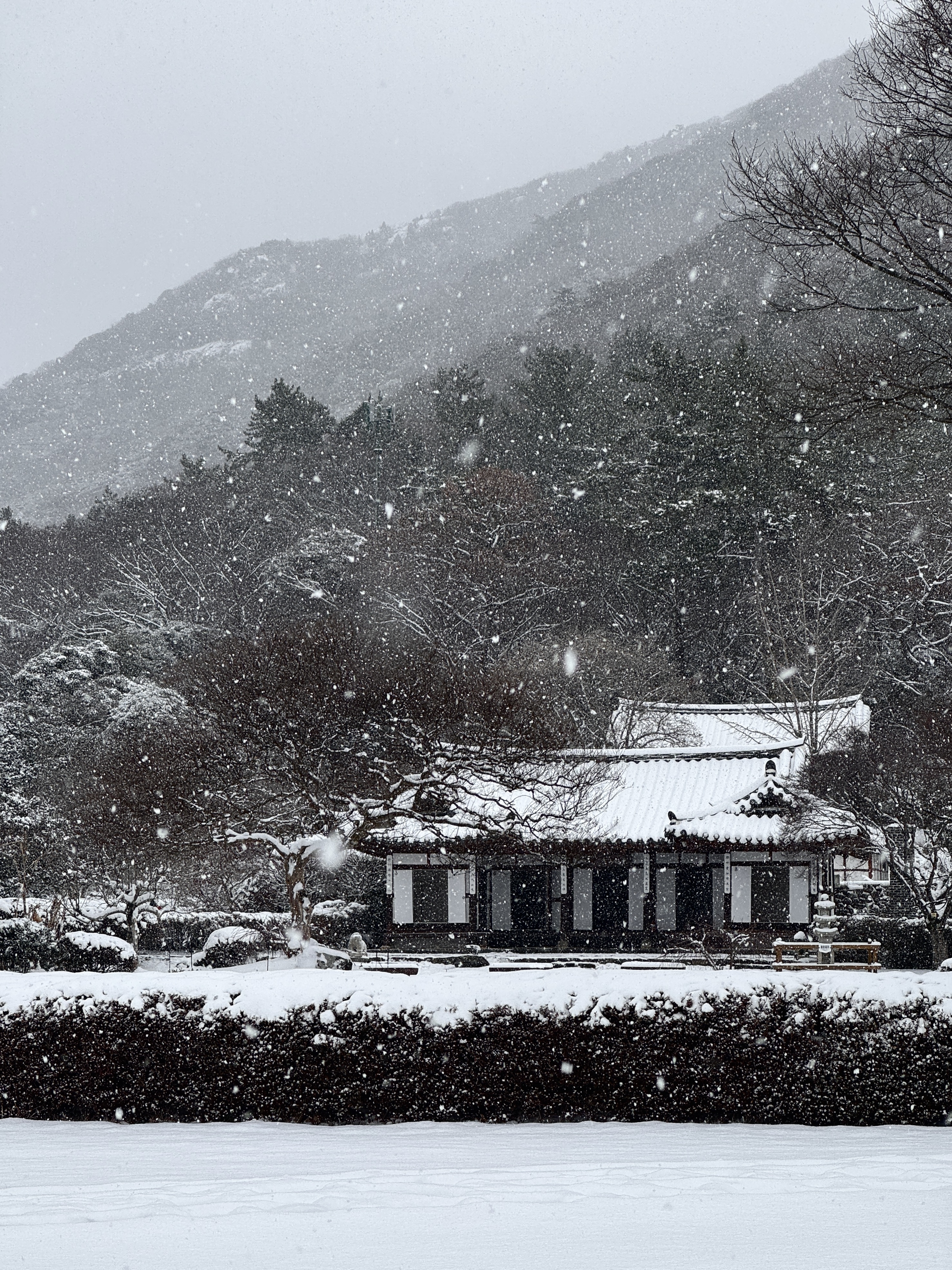 눈이 폭폭 내리는 진도의 운림산방. 첩첩이 있는 산들괴 한옥 건물들의 모습이 수묵화 처럼 보였어요.