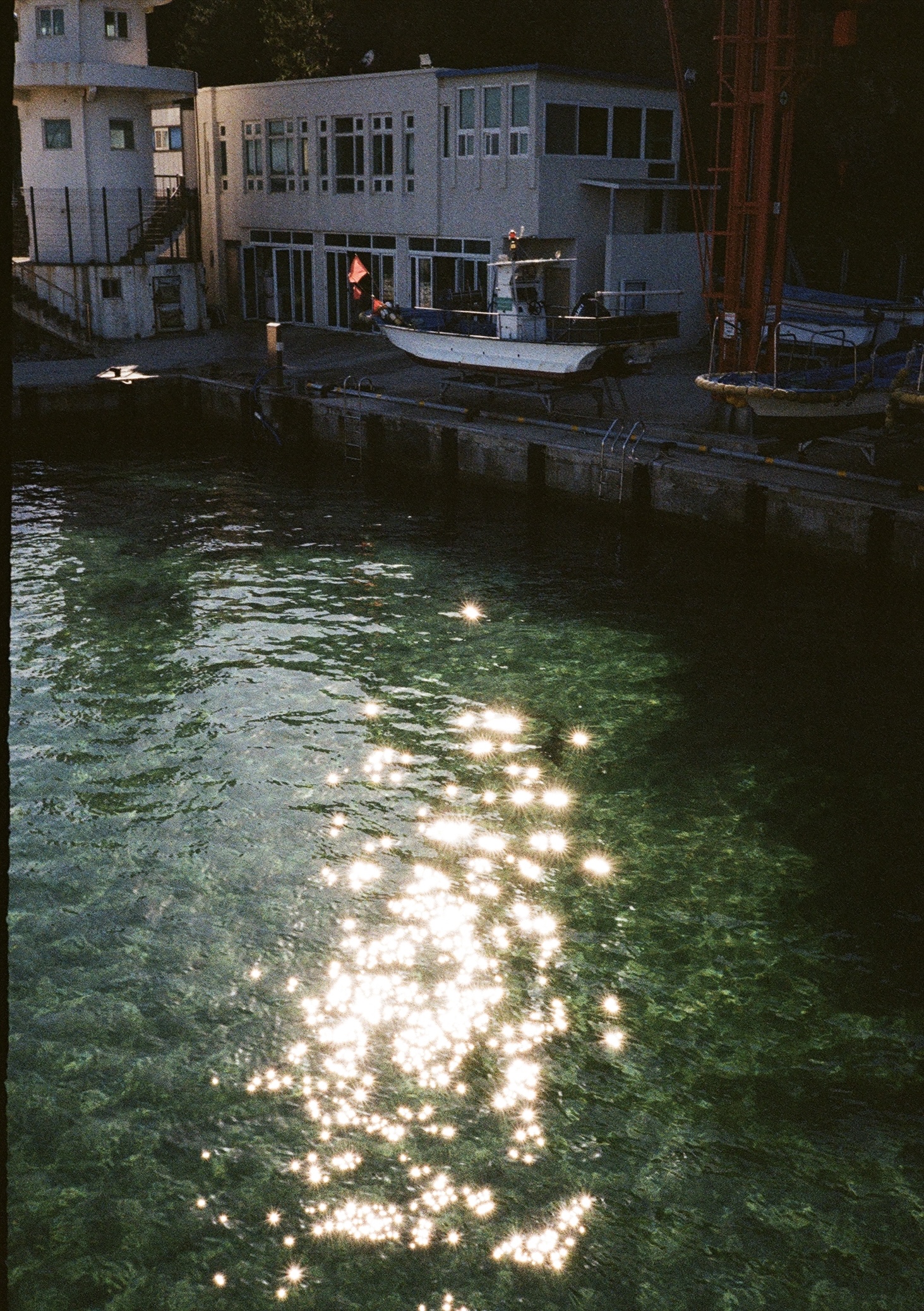 바다와 부두위 배 위로 올려진 반짝이는 빛이 포인트입니다.