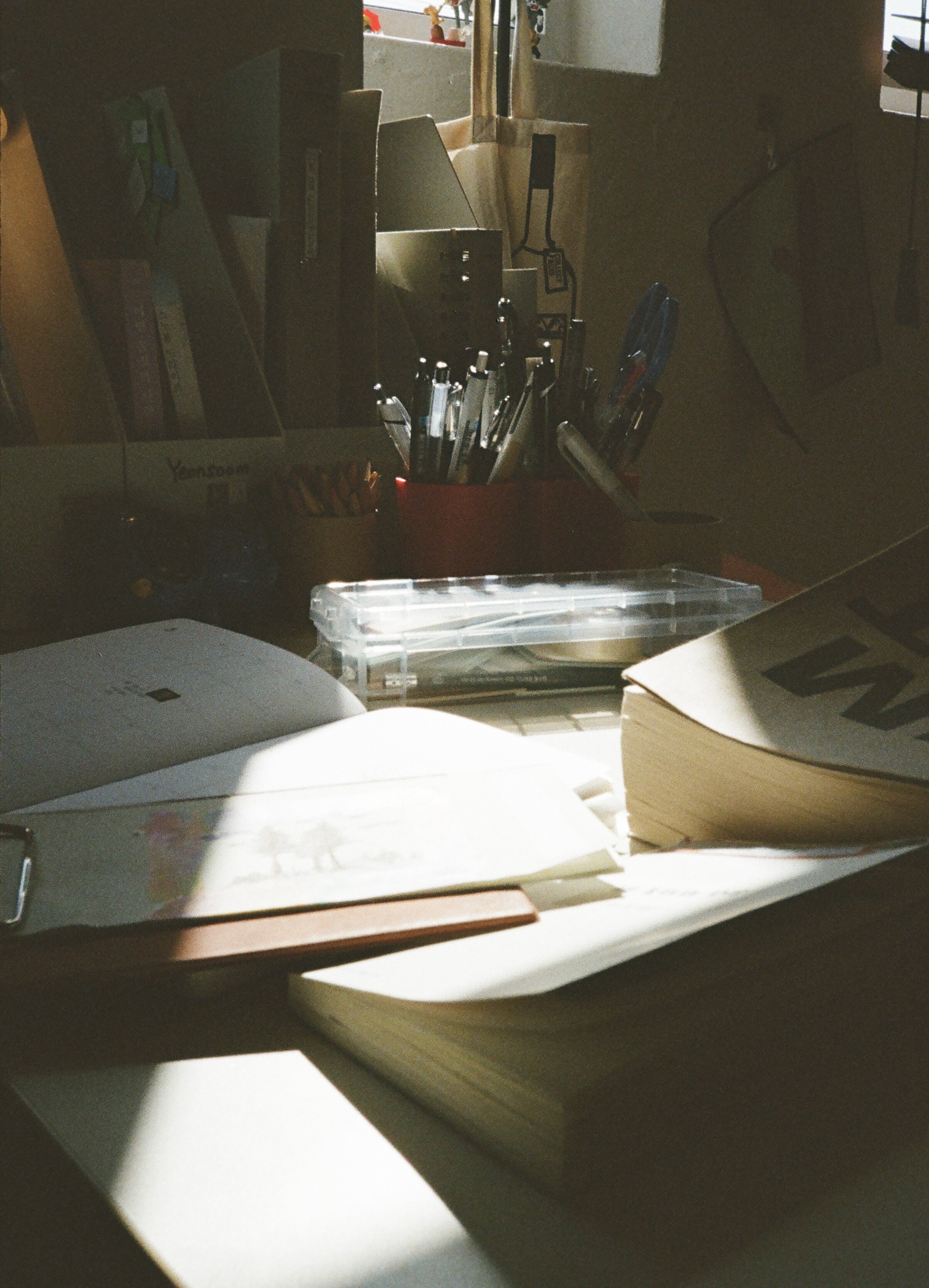 창 사이로 나온 빛이 책들과 다양한 필기구들에 따스한 빛을 반사하고 있다.