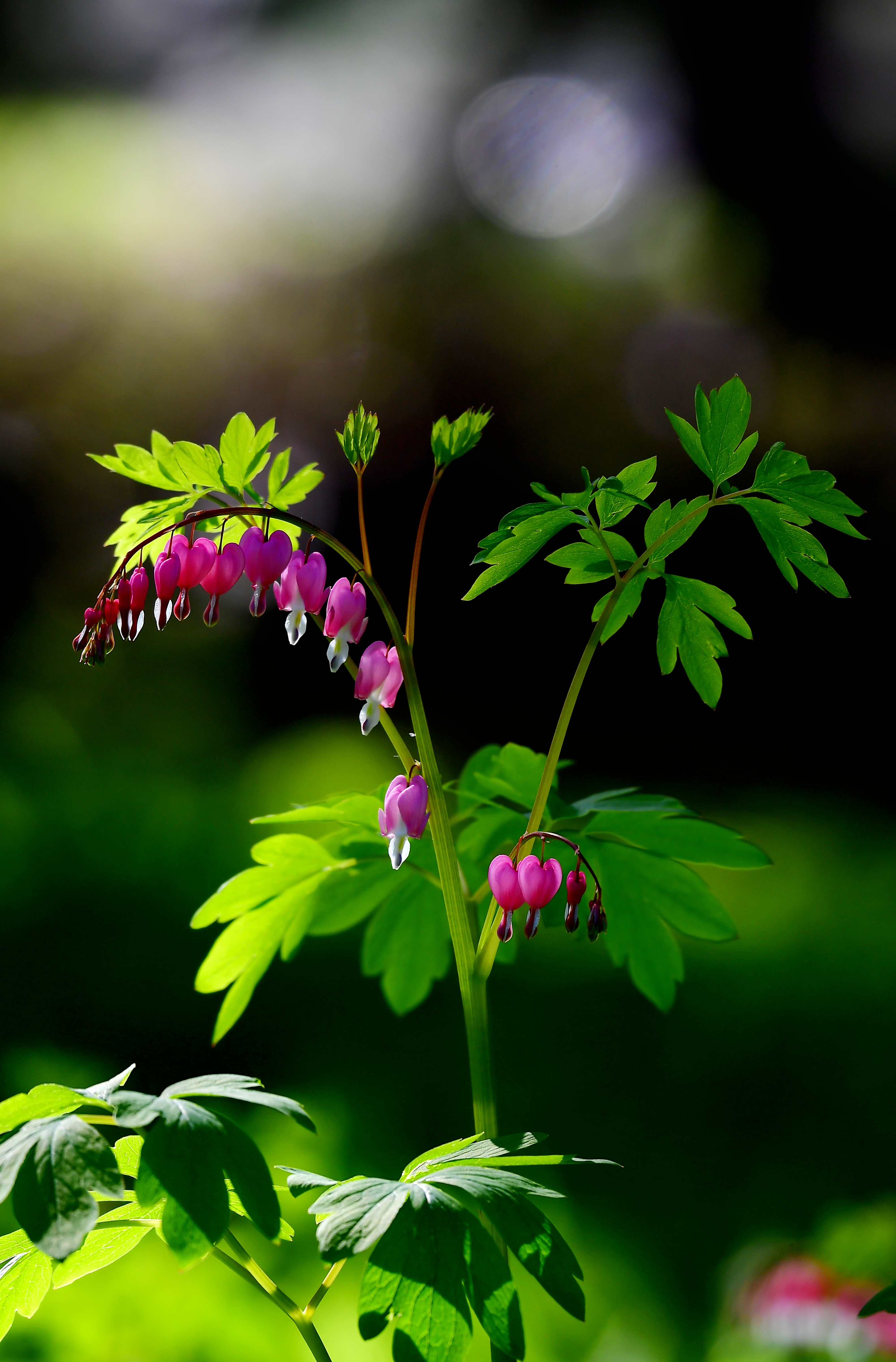 소나무숲 사이로 한줄기 빛이 들어옵니다. 그 빛의 줄기를 따라서 가지를 뻗고 꽃을 피워냅니다. 자연의 순리를 역행하지 않는 금낭화를 보면서 겸허함을 배웁니다.