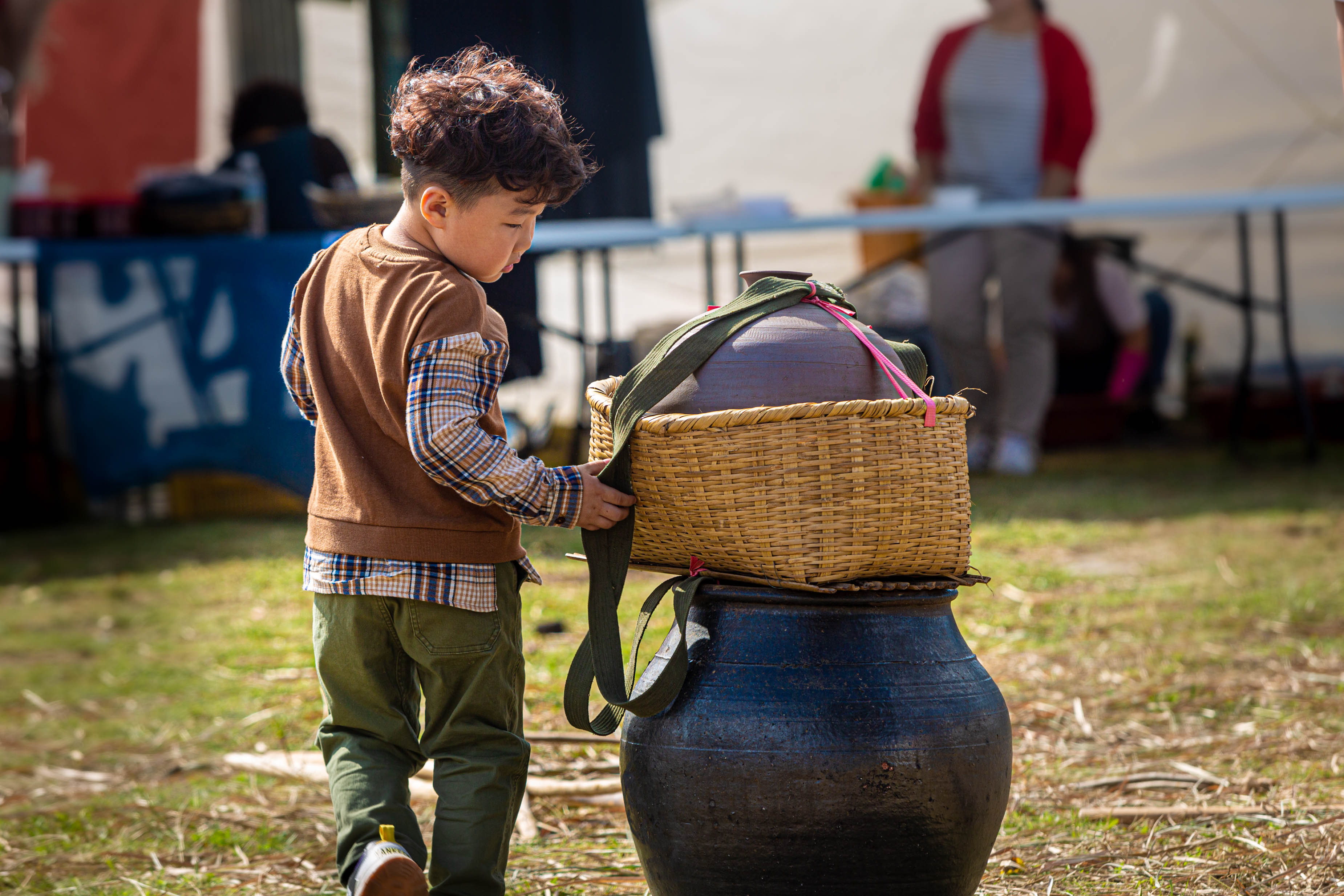 어느 축제 현장에서 체험을 위해 놓여있는 물허벅에 관심을 보이는 어린이