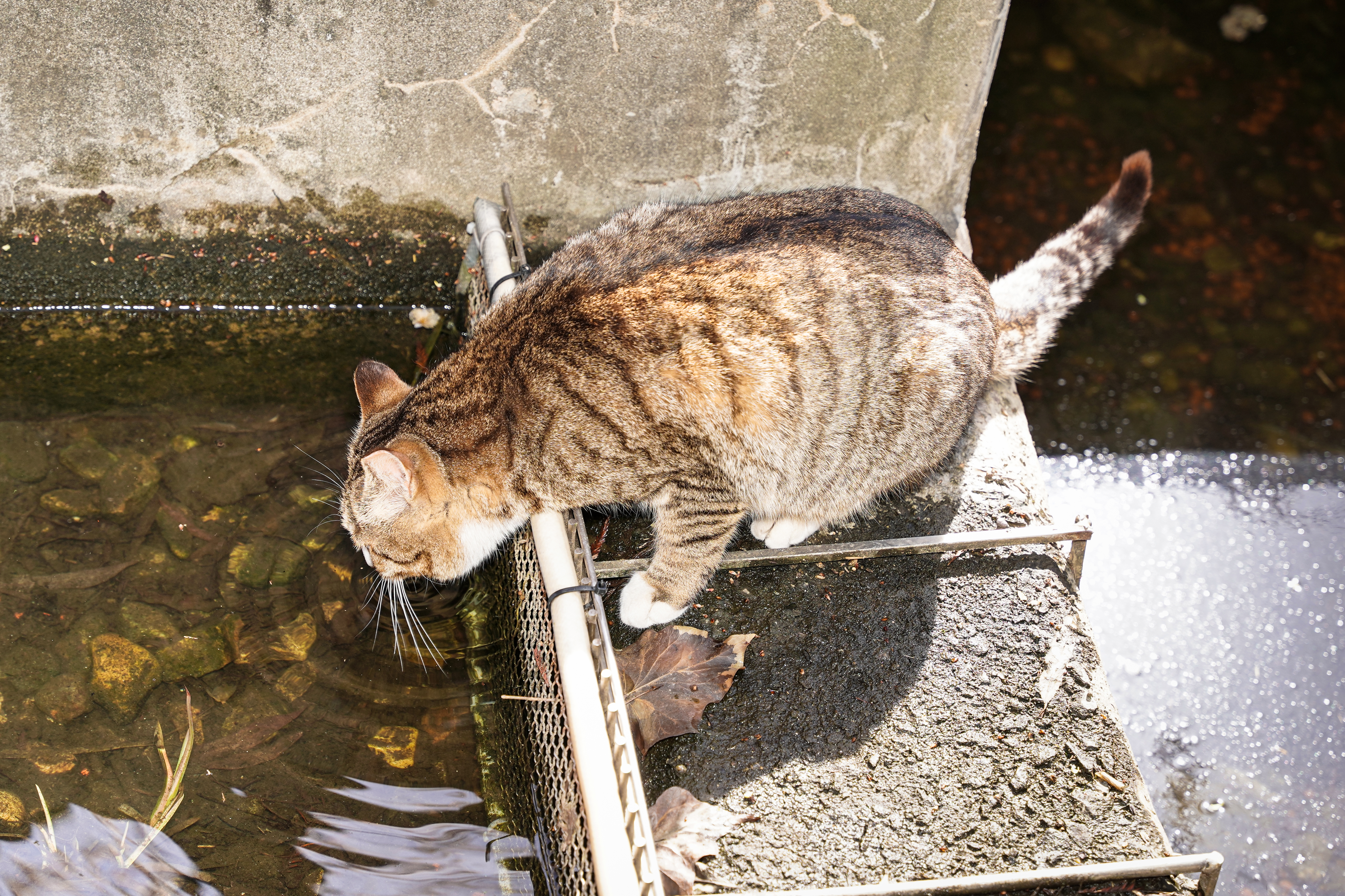 선유도에는 많은 생태고양이가 살고 있습니다.이녀석을은 일반적인 길냥이와 다르게 사람과 매우 친밀한 관계를 유지하며 지내죠.사람을 보면 쓰다듬어 달라고 머리를 비비고 배를깔고 눕는 녀석들입니다.잔뜩 애교를 부리다가 목이 말랐는지 생태시설을 휙휙 넘어가 물을 마시는 녀석의 모습을 담아봤습니다.