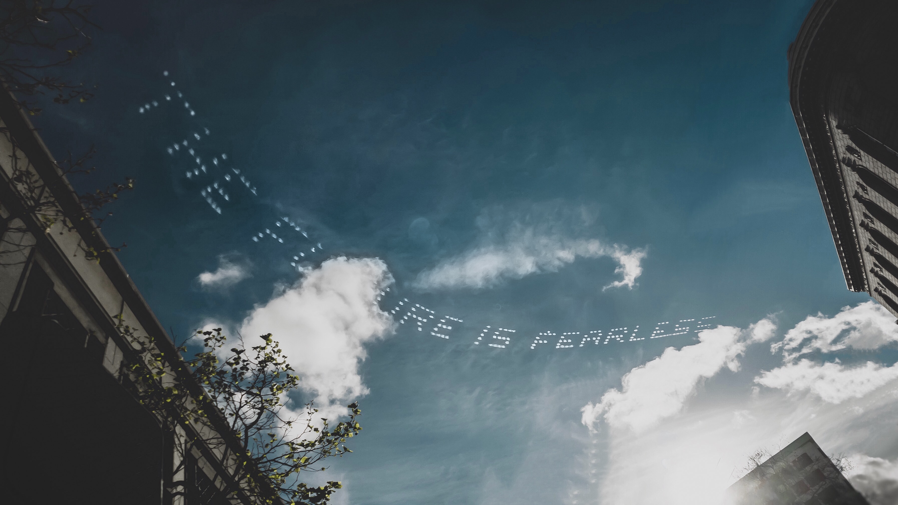 해외 여행 중 우연하게 발견한 하늘. the future is fearless. 미래는 두려움이 없다. 라는 문구의 비행운이 그려낸 멋진 글귀에 나는 한없이 하늘을 바라보고 사진을 담았다.