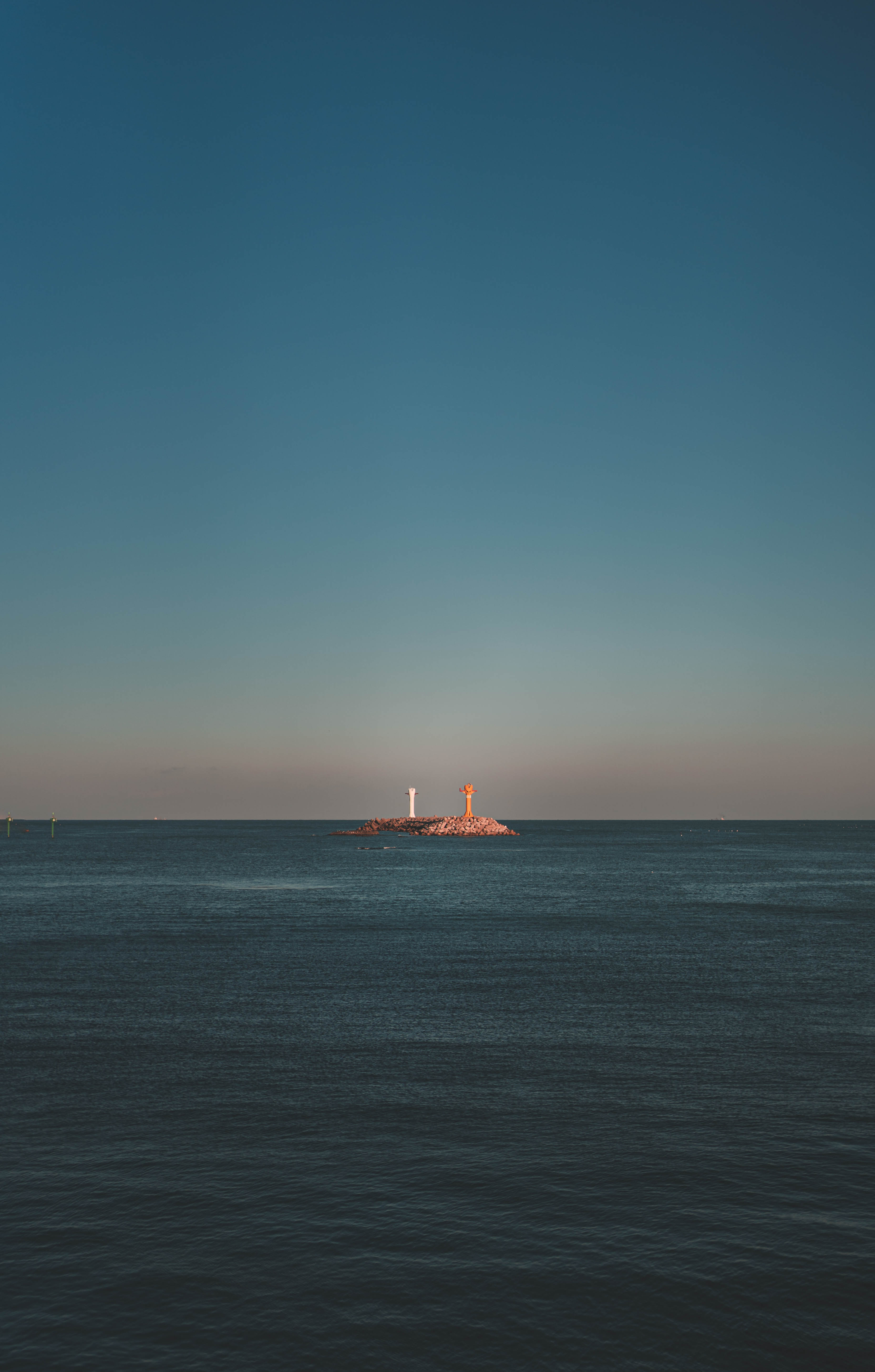 해 질 녘 바다에 가운데 있는 방파제와 등대를 촬영