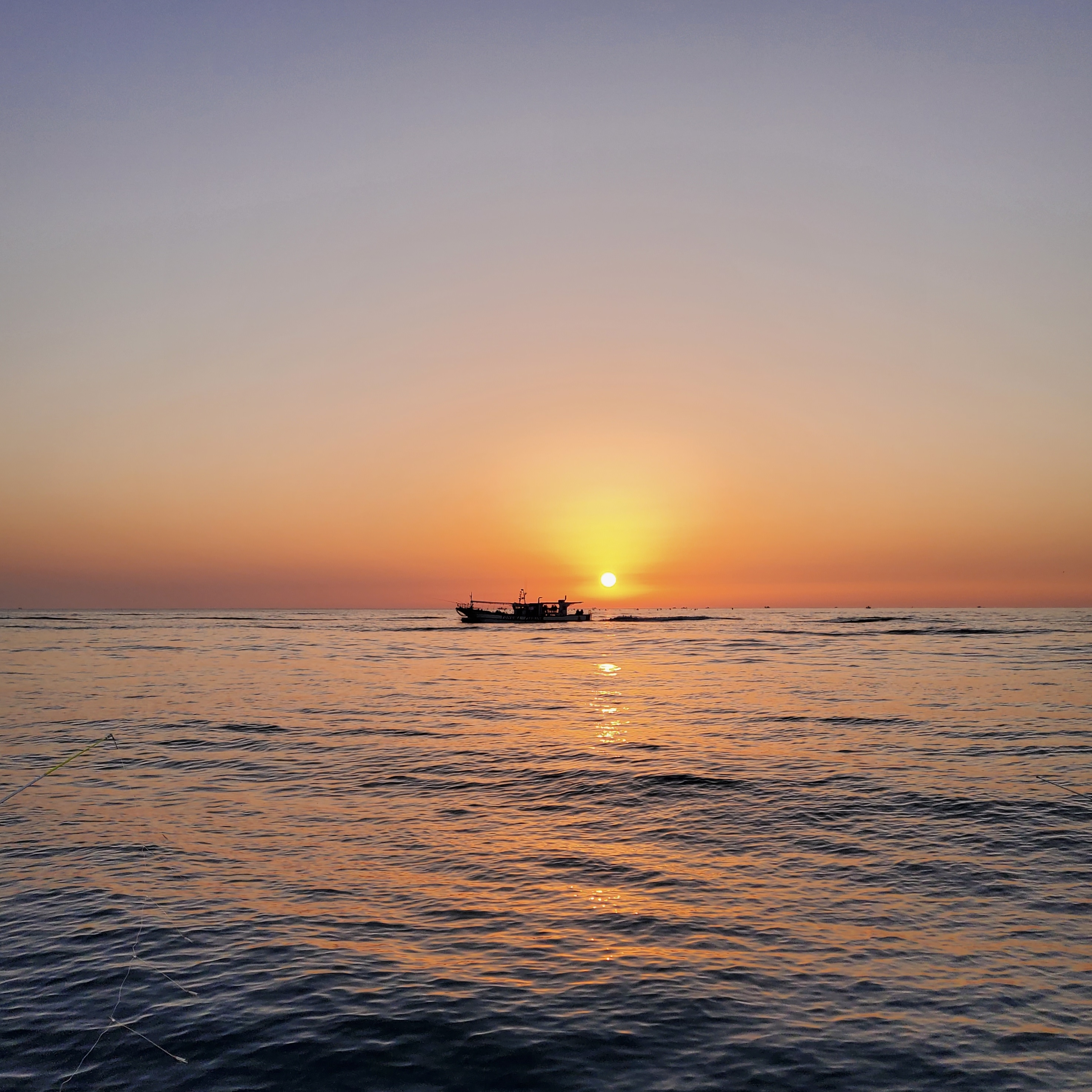 배에서 먹는 라면이 먹고 싶어 아빠를 따라 낚싯배에 올랐지만 체력이 딸려 힘겨웠더라죠^^ 그렇지만 힘든 걸 잊게 해줄 정도로 근사한 일출을 볼 수 있어 너무 행복했습니다. 멋진 일출에 지나가는 배까지 더해져 더할 것 없이 눈부신 풍경이었습니다.