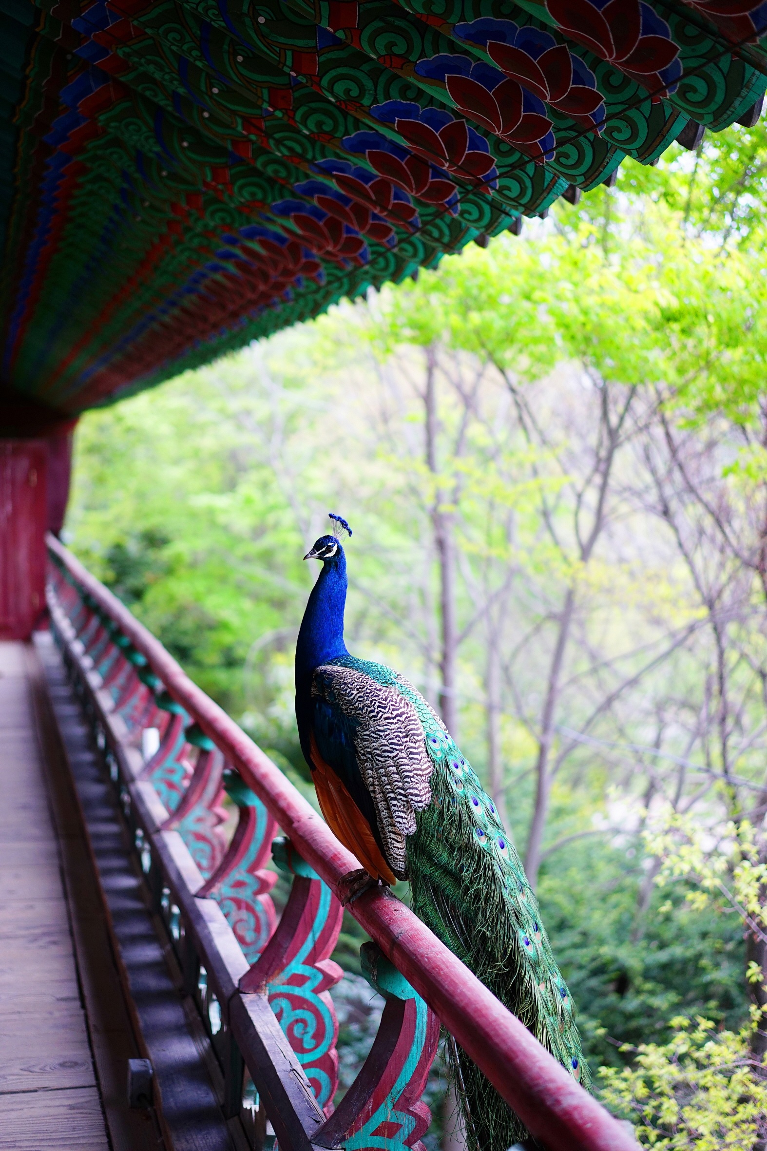 장소는 금낭화와 공작새로 유명한 통도사 서운암입니다.사찰내를 자유롭게 돌아다니는 공작새인지라 적절한 포인트로 이동할때까지 계속 따라 다니며 담은 사진입니다.
