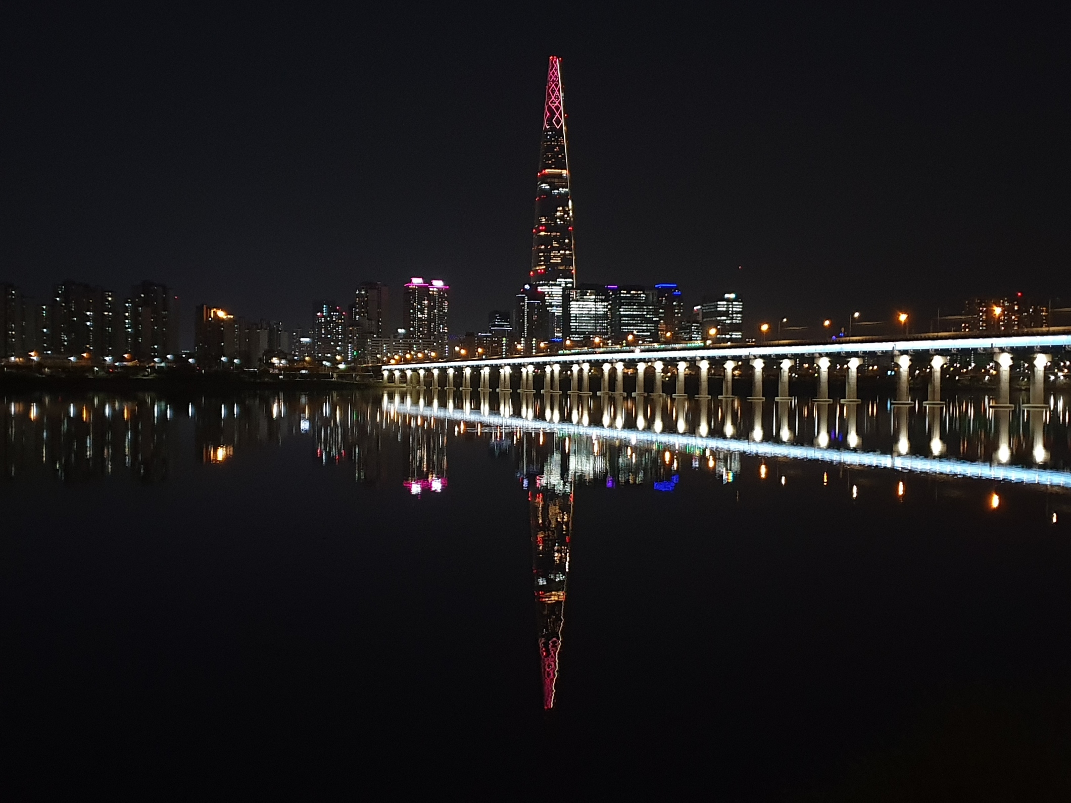산책중에 찍었습니다.카메라는 집에 있었지만아쉬운대로 손각대로 스마트폰 붙잡고 심호흡하고 찍었더니 실제로 보는 느낌이 조금 묻어 났습니다.한강에 투영된 대한민국 최고 높이...