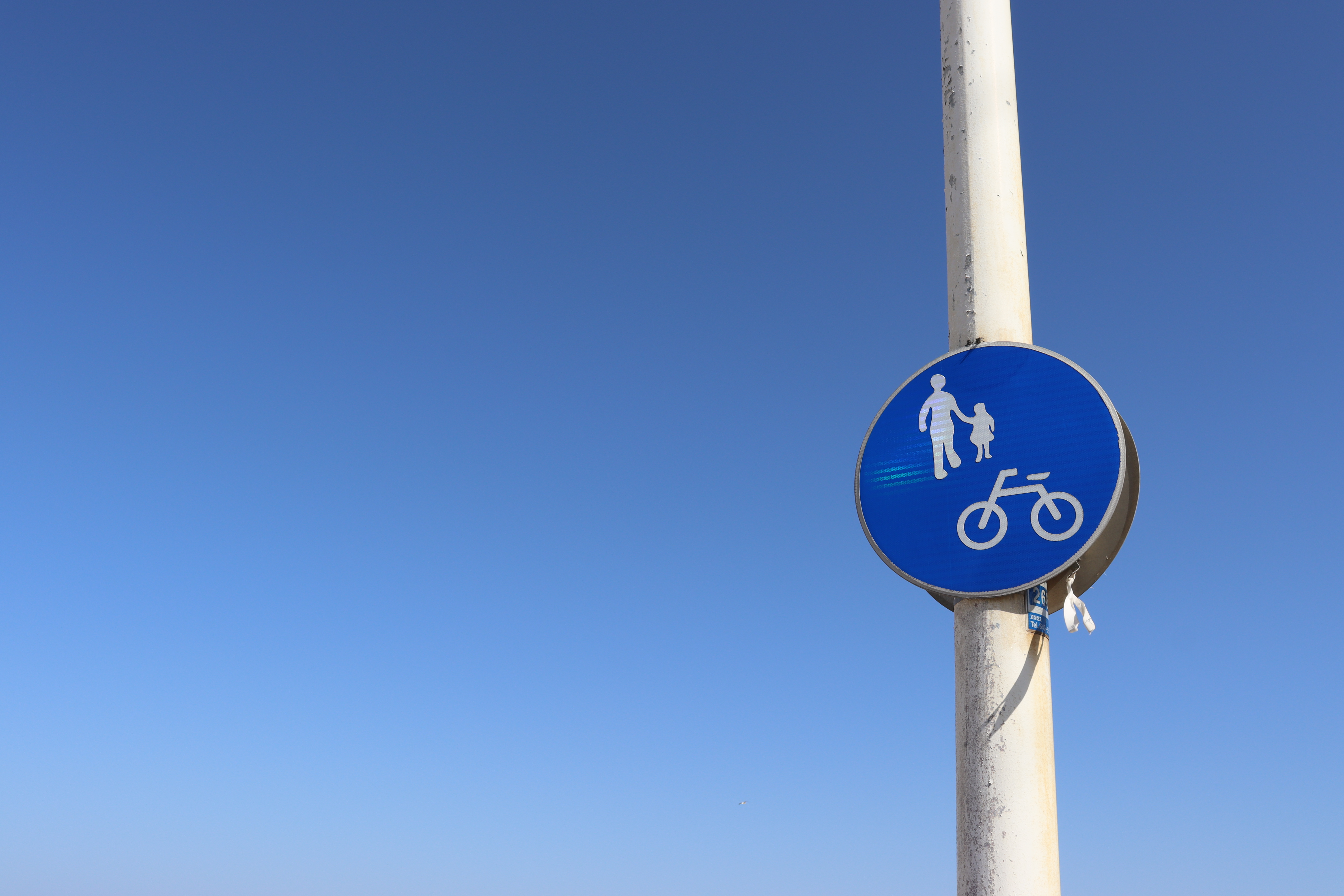 구름한점 없는 하늘과 가로등에 붙어있는 표지판