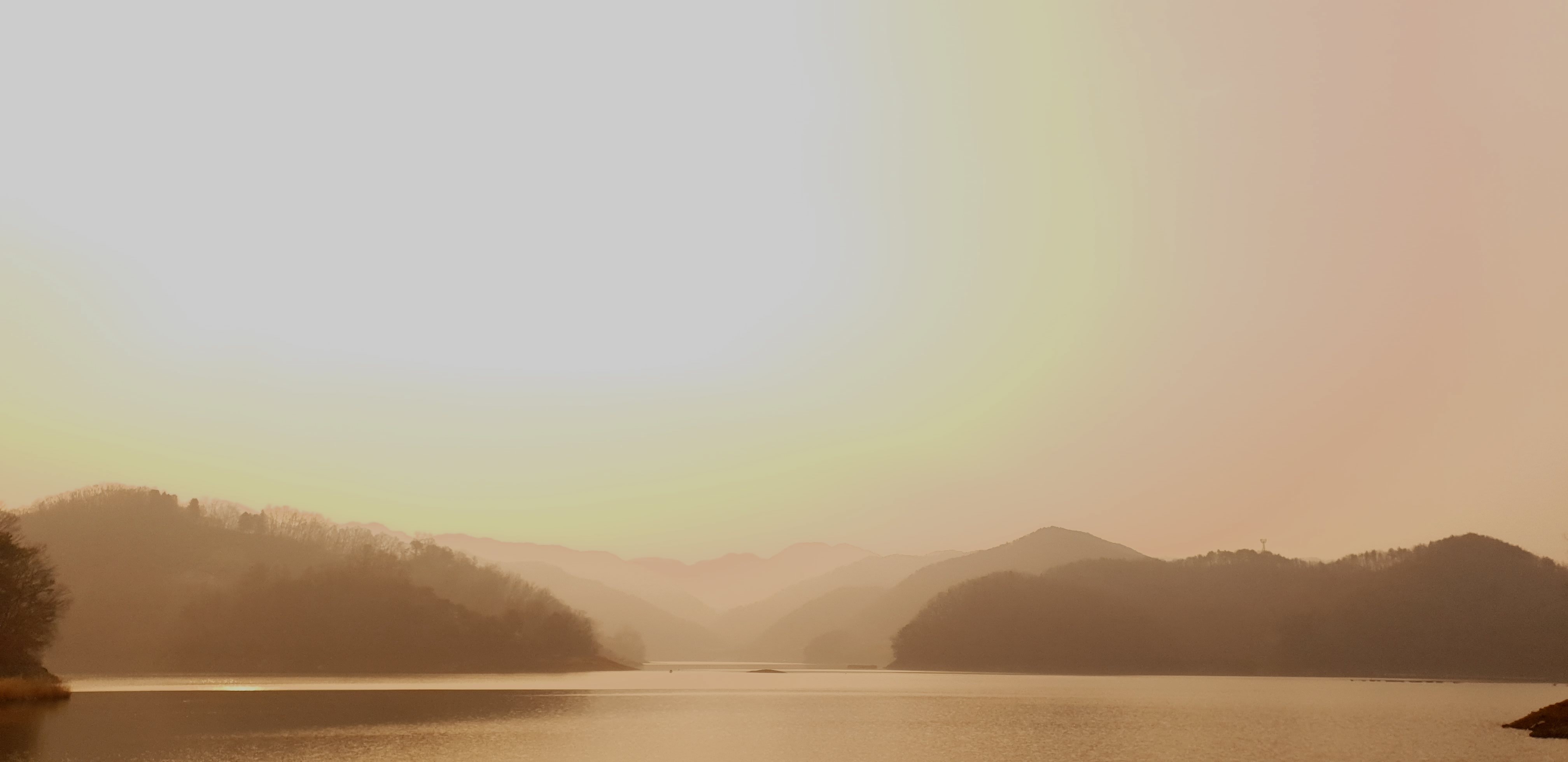 과한 설정 속 아스라이 보이는 산세의