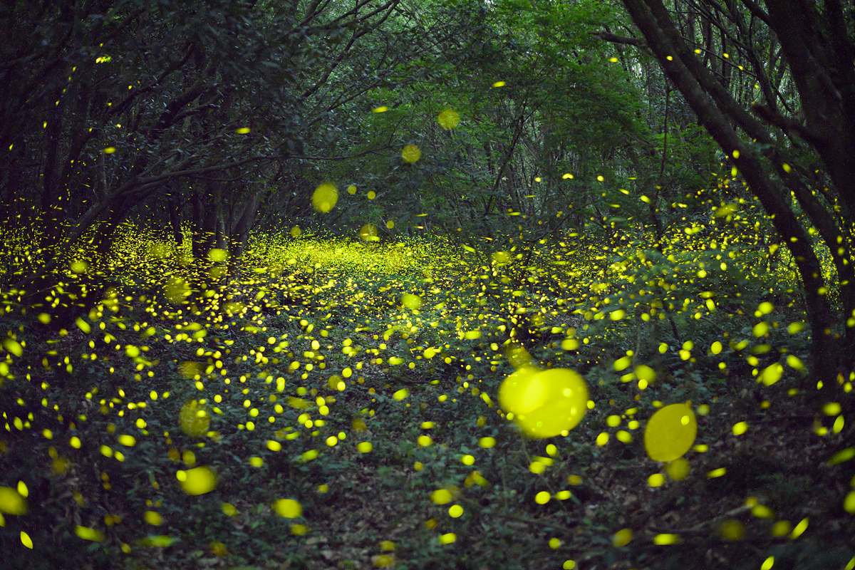 짝을 찾기 위하여 숲을 가로지르며 나는 반딧불이로 환하게 불 밝힌 여름밤, 반딧불이 숲의 모습입니다.