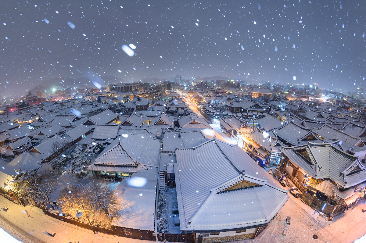 겨울 눈 내리는 전주 한옥마을 풍경입니다.