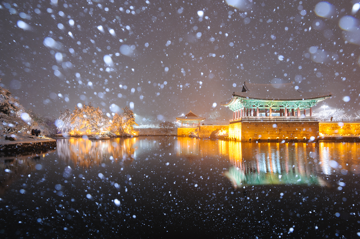 겨울 눈 내리는 경주 동궁과 월지의 풍경입니다.