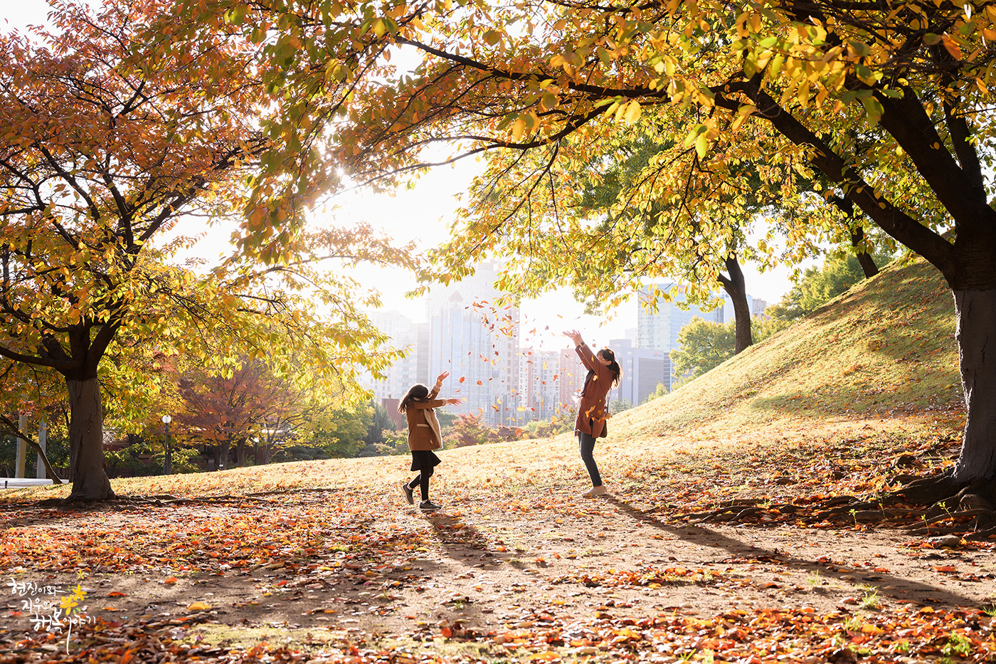 지나가는 가을을 기억하기 위해 낙엽 놀이를 즐기고 있는 가족의 모습입니다.