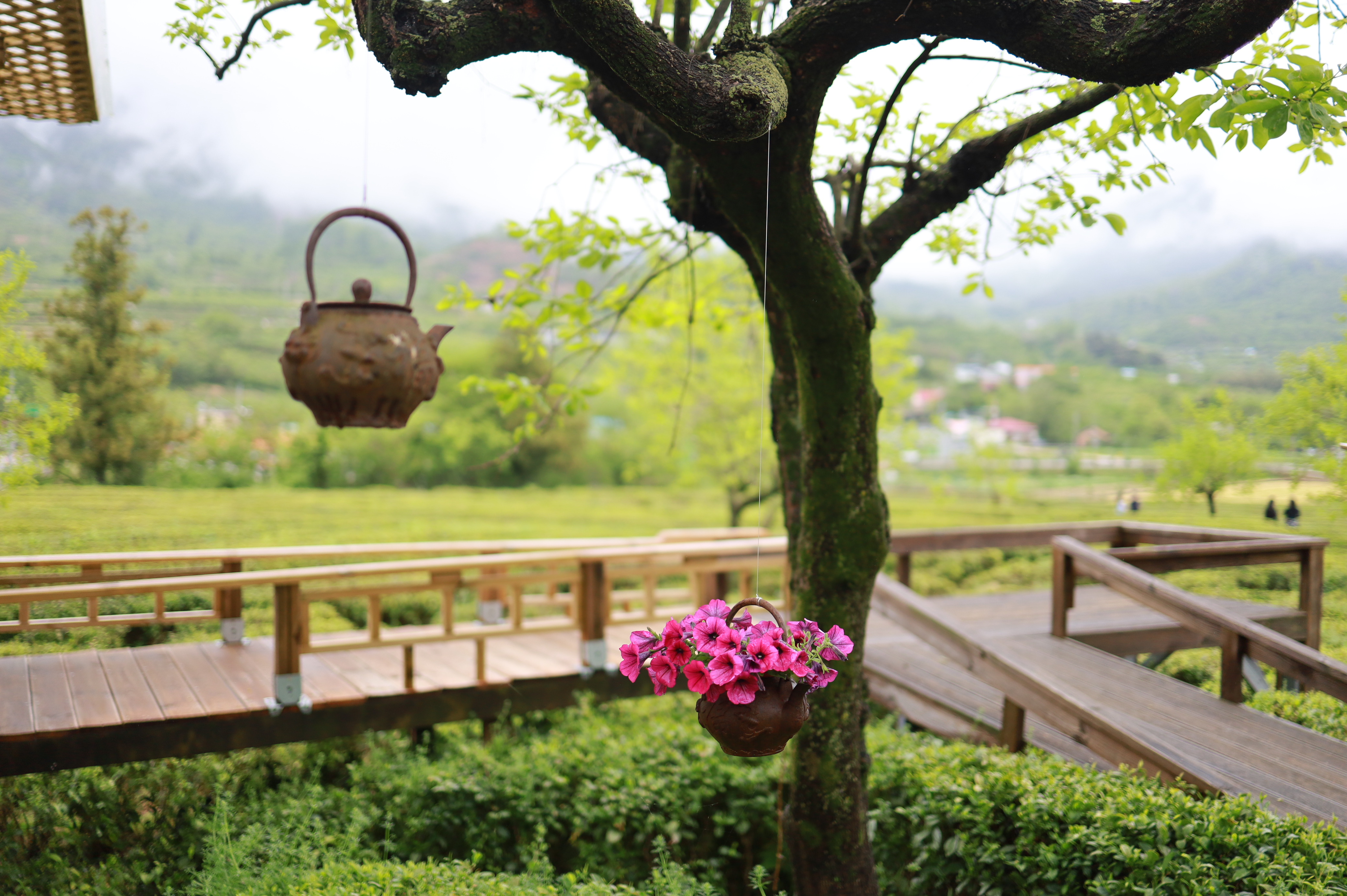 나무에 걸려있는 주전자에 꽃