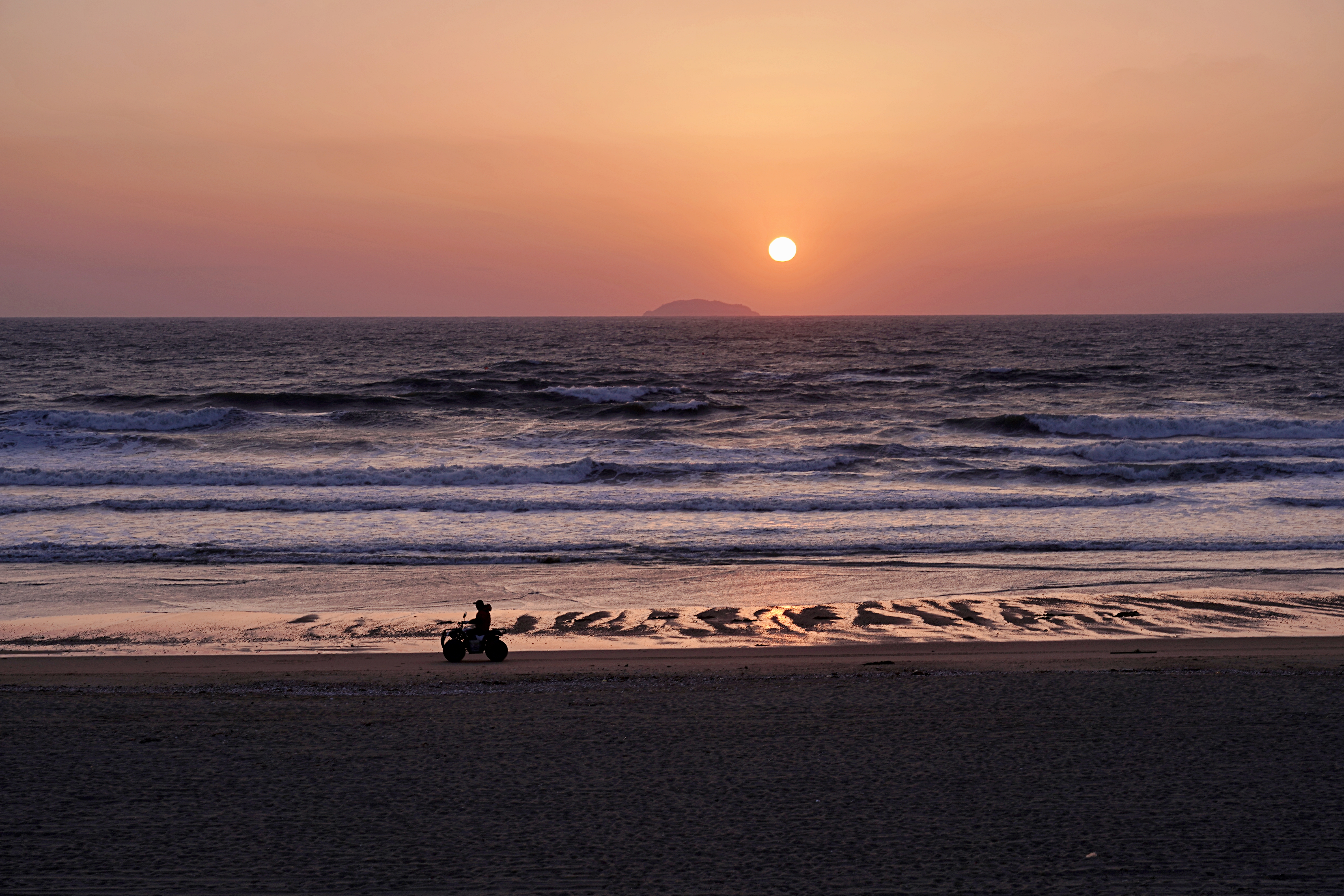 팬더믹 시대에 조심스럽게 안면도 쪽으로 여행을 다녀왔습니다. 이 날 4월 중순 임에도 불구하고 체감기온이 2도에 강한 바람이 불어 손이 얼 정도였는데 지금까지 본 일몰 중 가장 완벽한 원형의 태양을 즐기고 있는 순간 백사장을 달리는 바이크가 있어 순간적으로 셔터를 눌렀습니다.