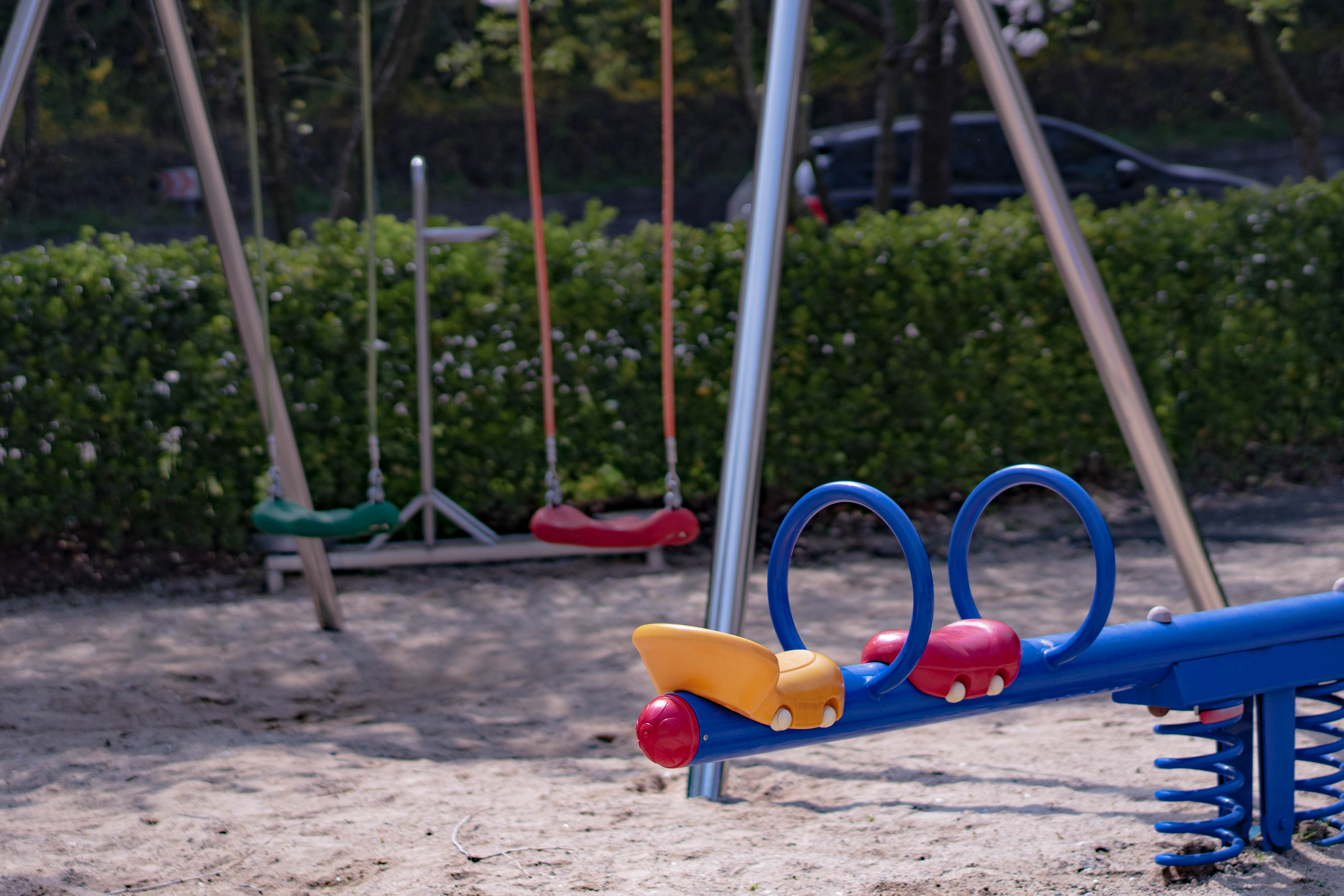 아이들이 시끌벅적한 놀이터의 모습이 줄어들고 있다 적막함이 흐르는 놀이터의 모습 속에서 알록달록한 색의 시소만이 밝은 에너지를 품고있다