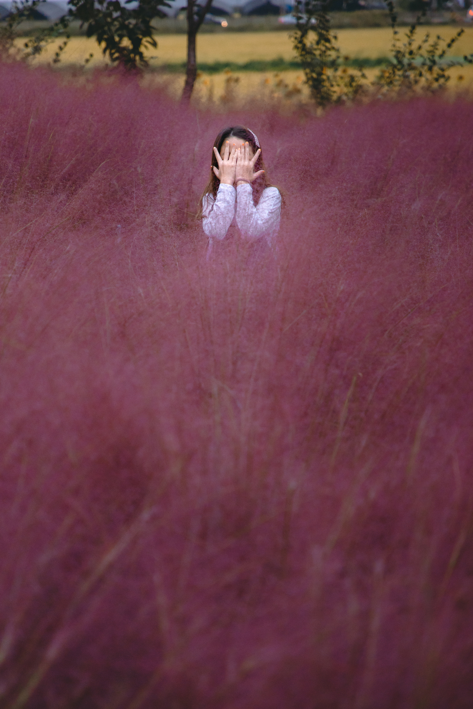 핑크뮬리 밭에서 사진 찍기를 거부하는 딸