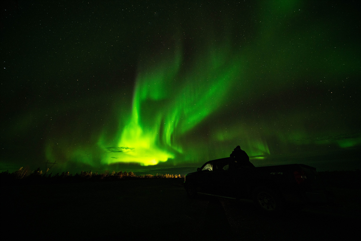 옐로나이프에서 오로라를 헌팅하는 중, 기대했던 오로라의 멋진 장면을 담고 싶었는데 못담고 돌아가던 길에 너무 피곤해서 창밖을 멍하게 보았습니다. 그러던 중 갑자기 여태껏 보지 못한 오로라가 터지는 장면을 보고, 급하게 갓길에 차를 세우고 오로라의 모습을 담았습니다.