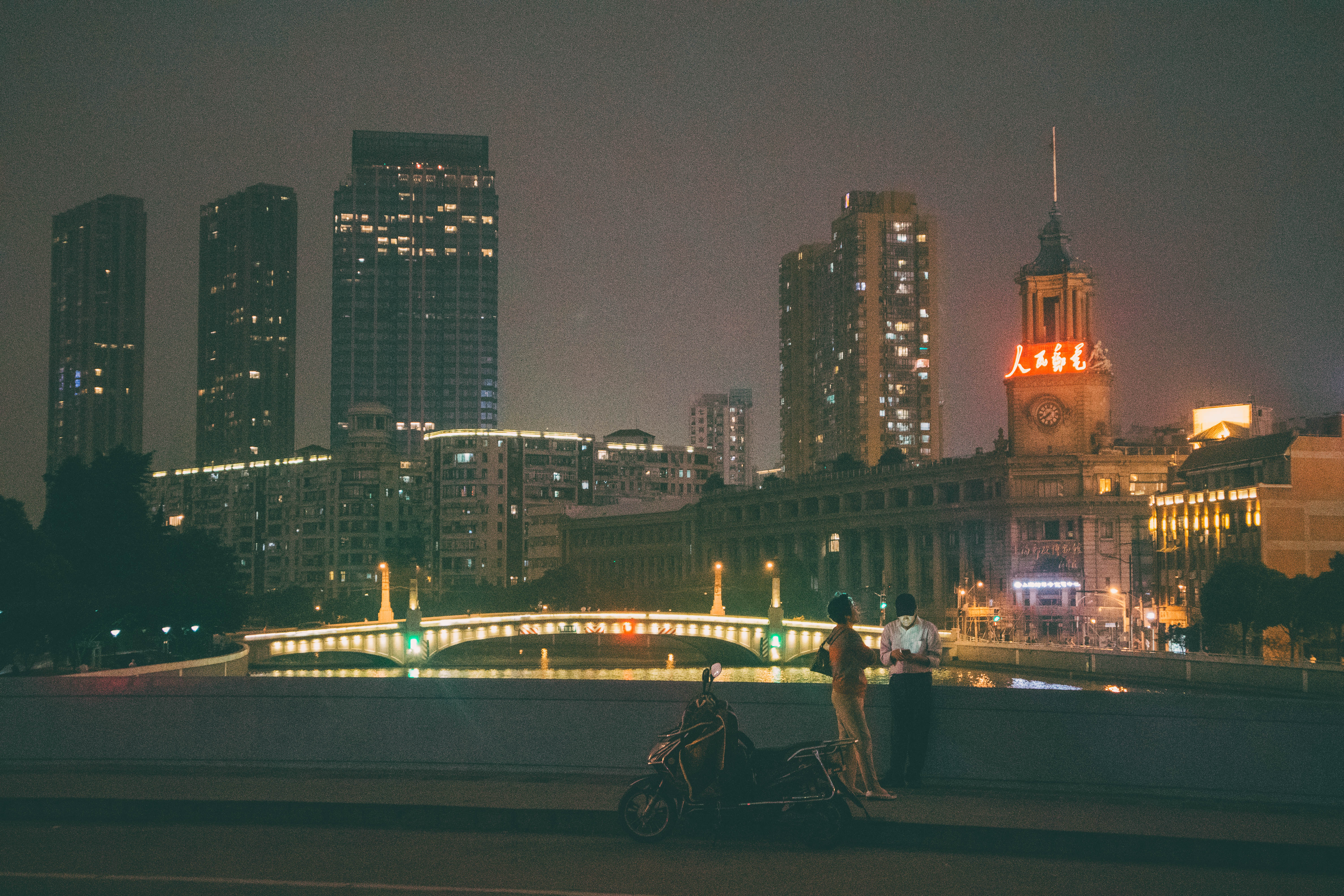 거대한 도시 풍경 아래 서로 다른 곳을 바라보는 두 사람