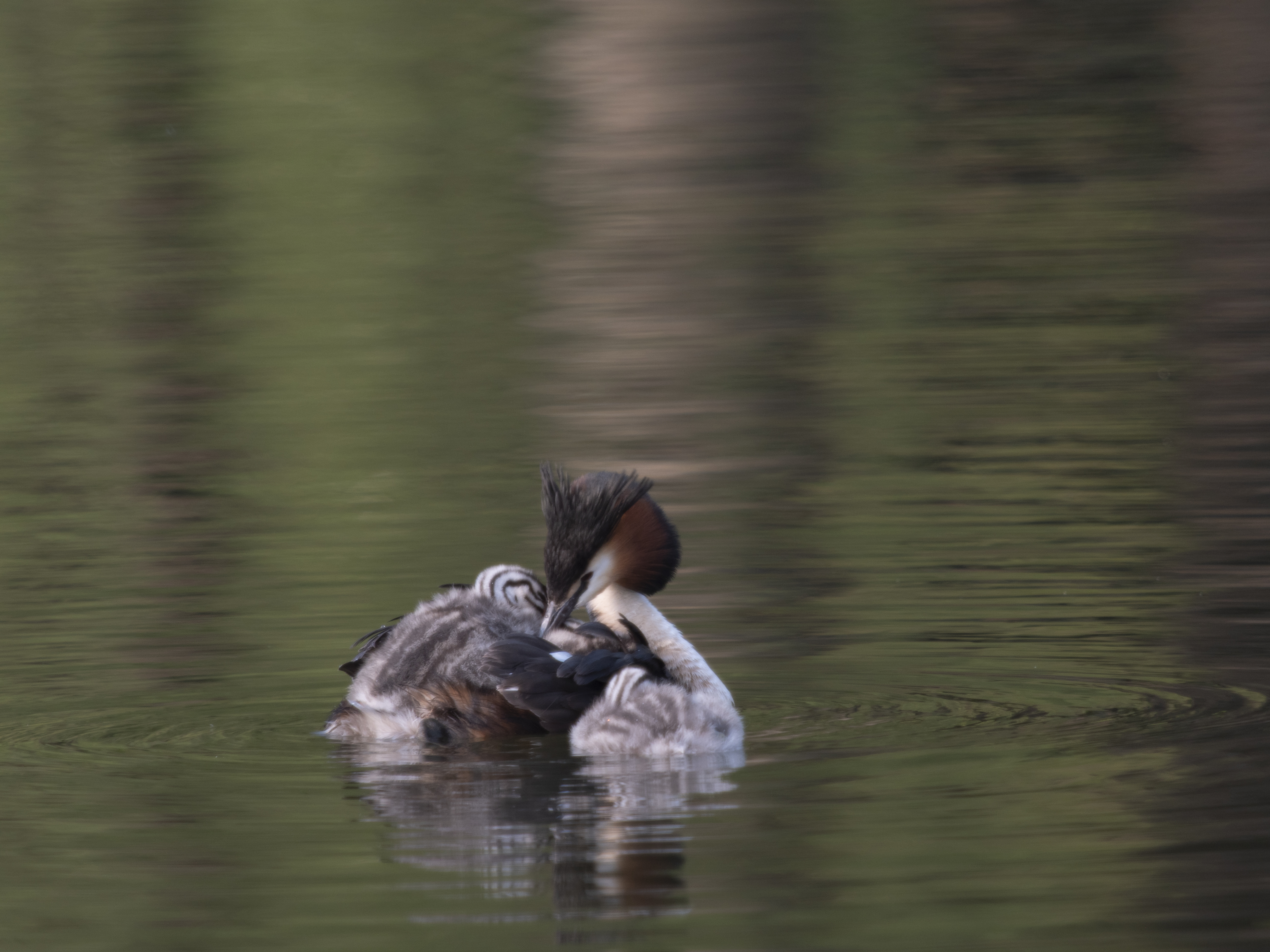 뿔논병아리 어미가 아이들을 등에 태우고 보듬고 있었다.