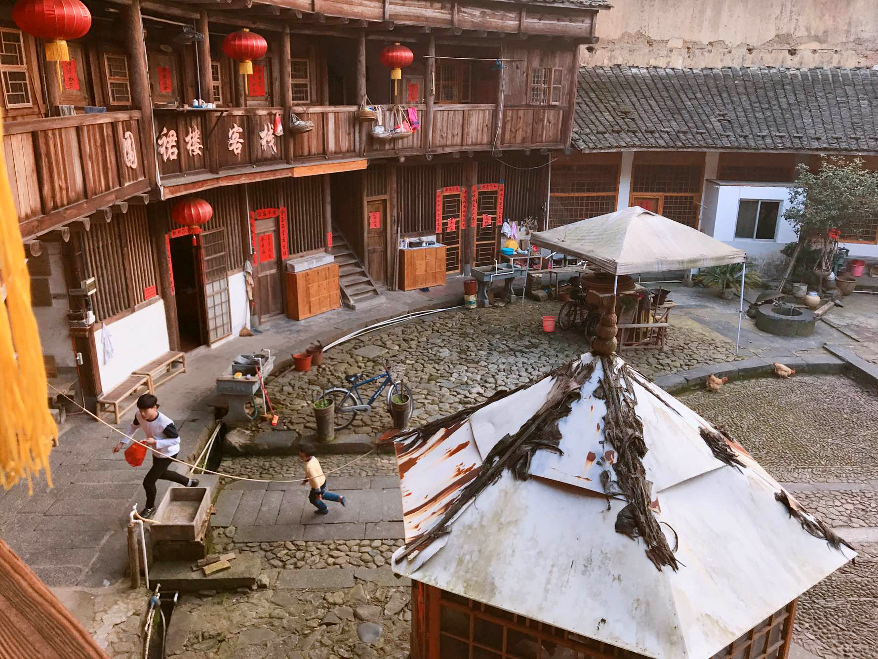 중국 복건성에 위치한 중국 전통가옥 토루, 중국인 아이와 술래잡기 하고있는 나의 모습.