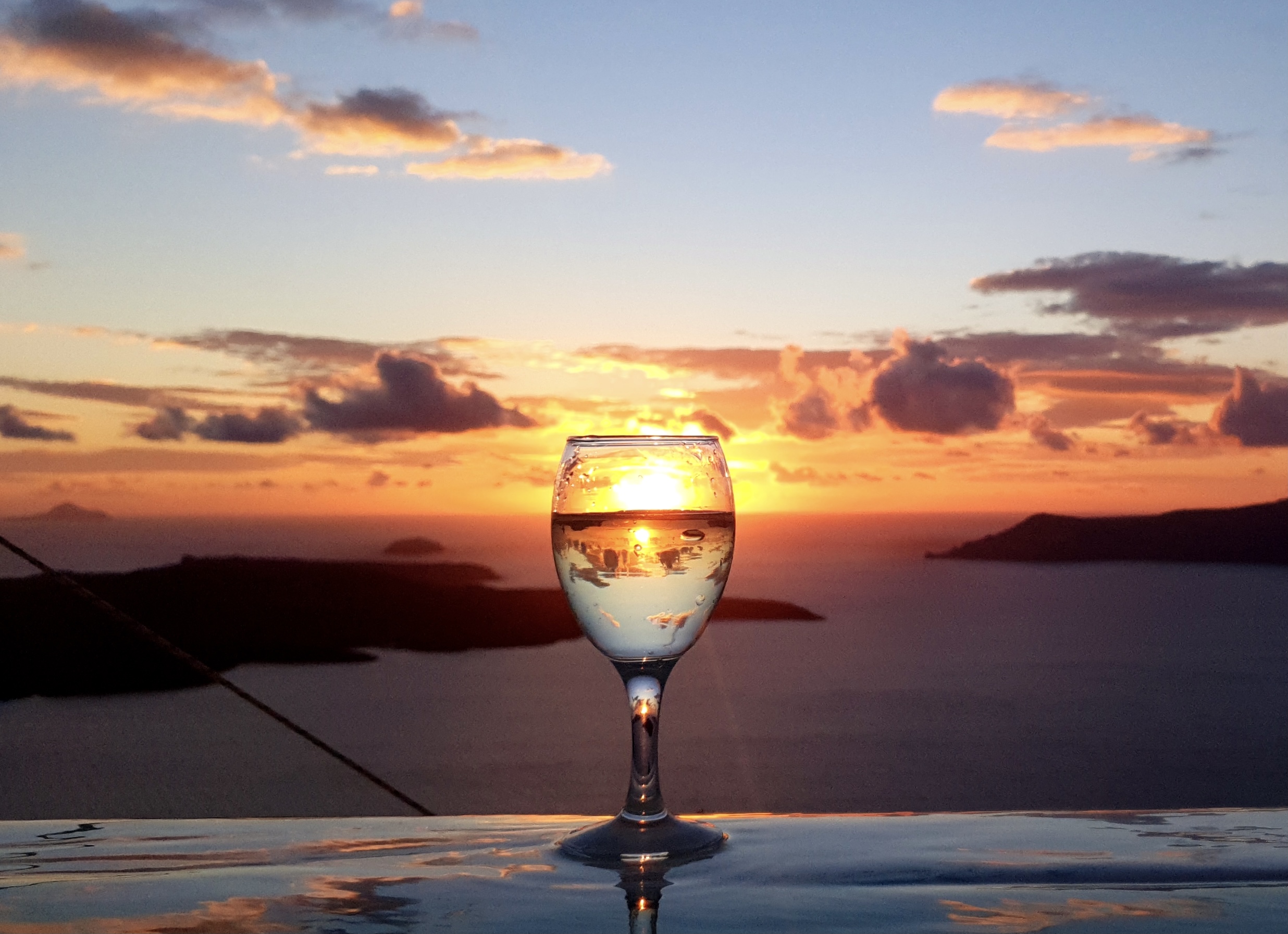 3대 선셋 명소로 불리는 에게해의 일몰을 와인잔에 투영하여 찍어보았다. 현실의 노을빛과 구름을 충실히 담아 더욱 아름다운 와인잔이, 마치 한 폭의 캔버스와 같다는 생각이 들었다.
