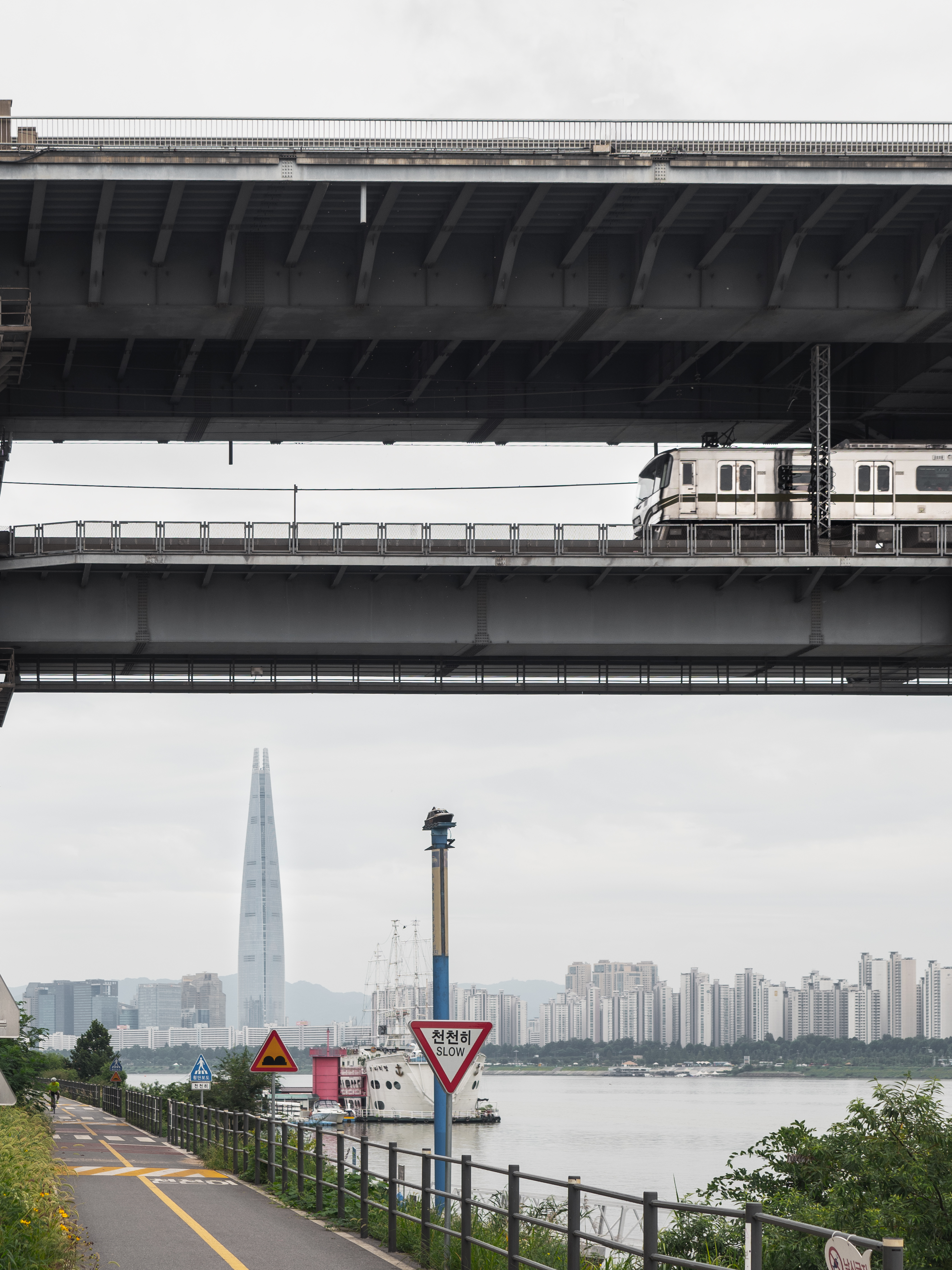 전철 프레임 안으로 롯데타워를 담았습니다. 한강은 덤이구요