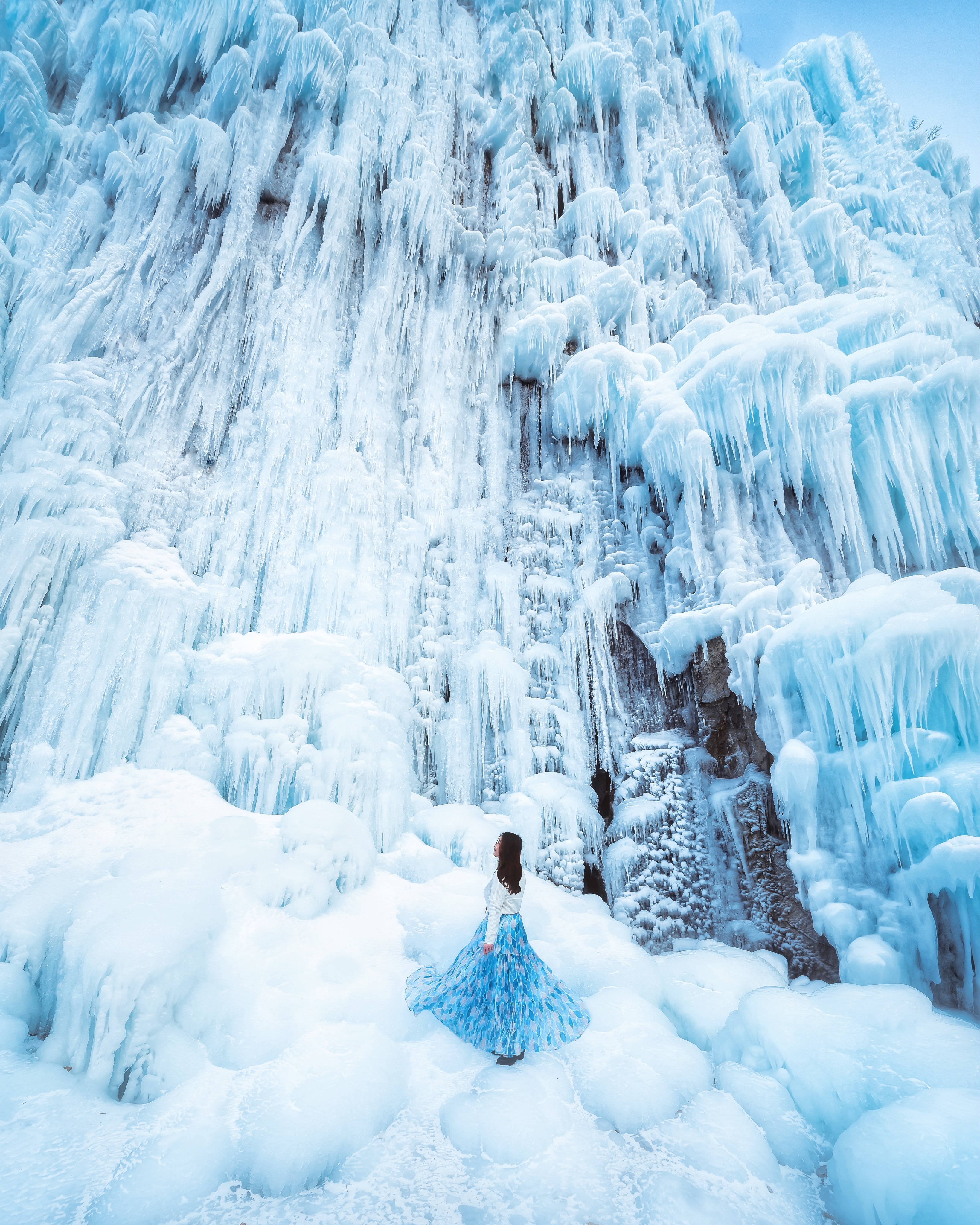 얼음골 밑에 서있는 여자. 겨울왕국 느낌으로 촬영했습니다