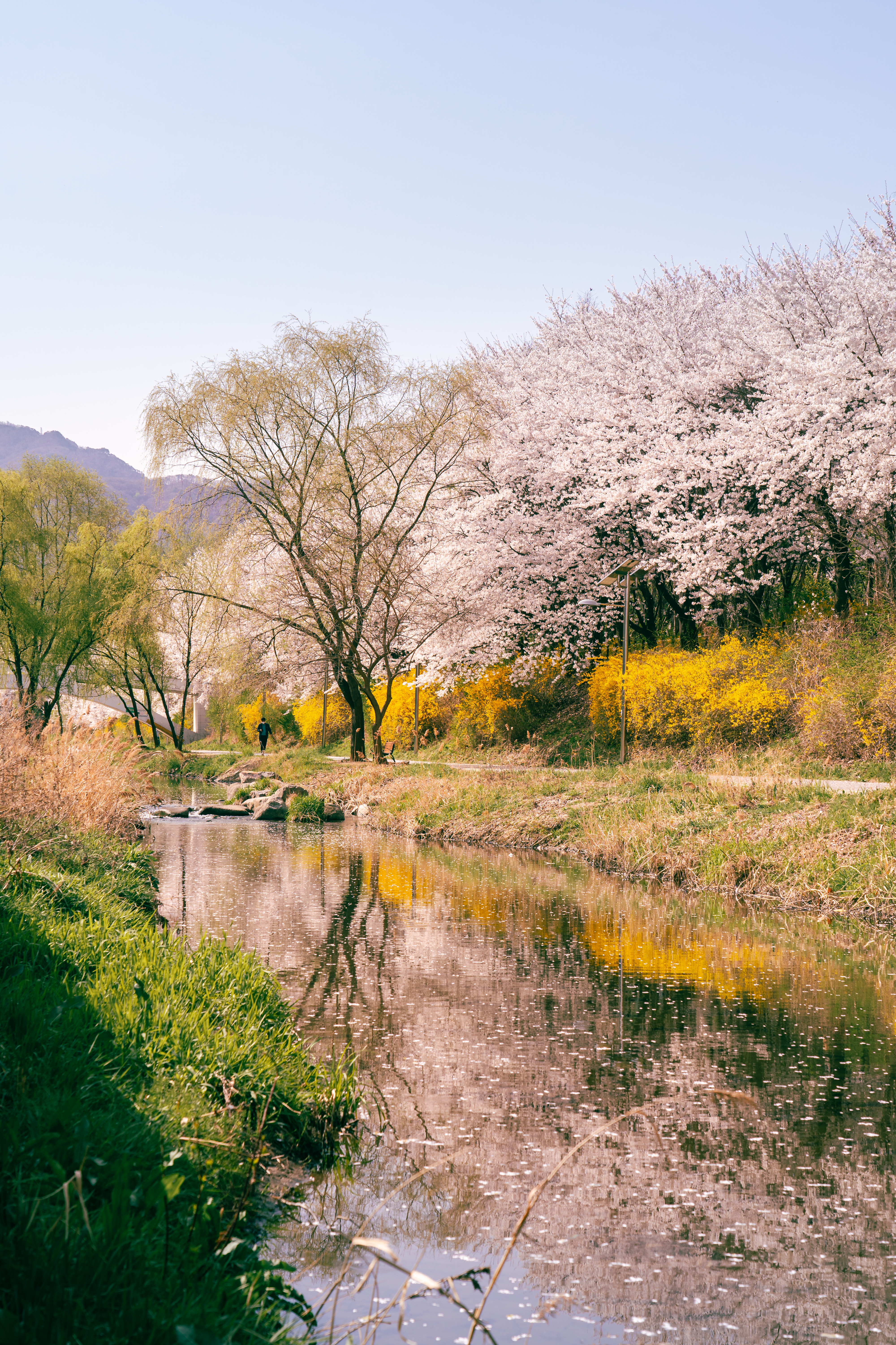 양재천 교량 밑에서 반영된 벚꽃과 개나리를 담았습니다