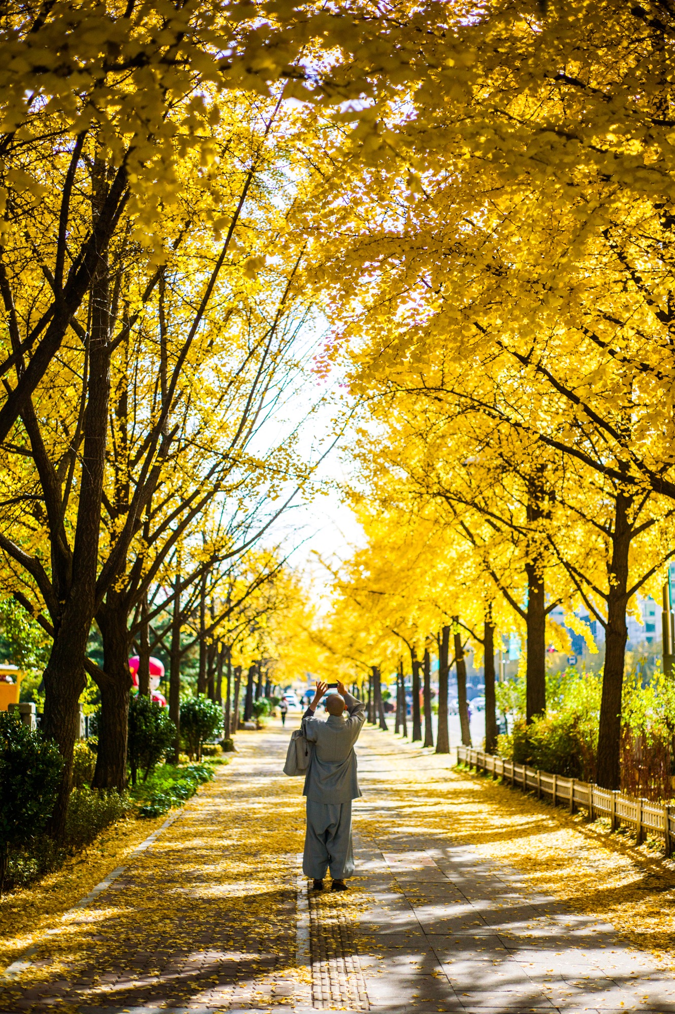 노란빛 가득한 가을 풍경 사이에서, 길을 멈춰 사진을 담는 이의 모습.