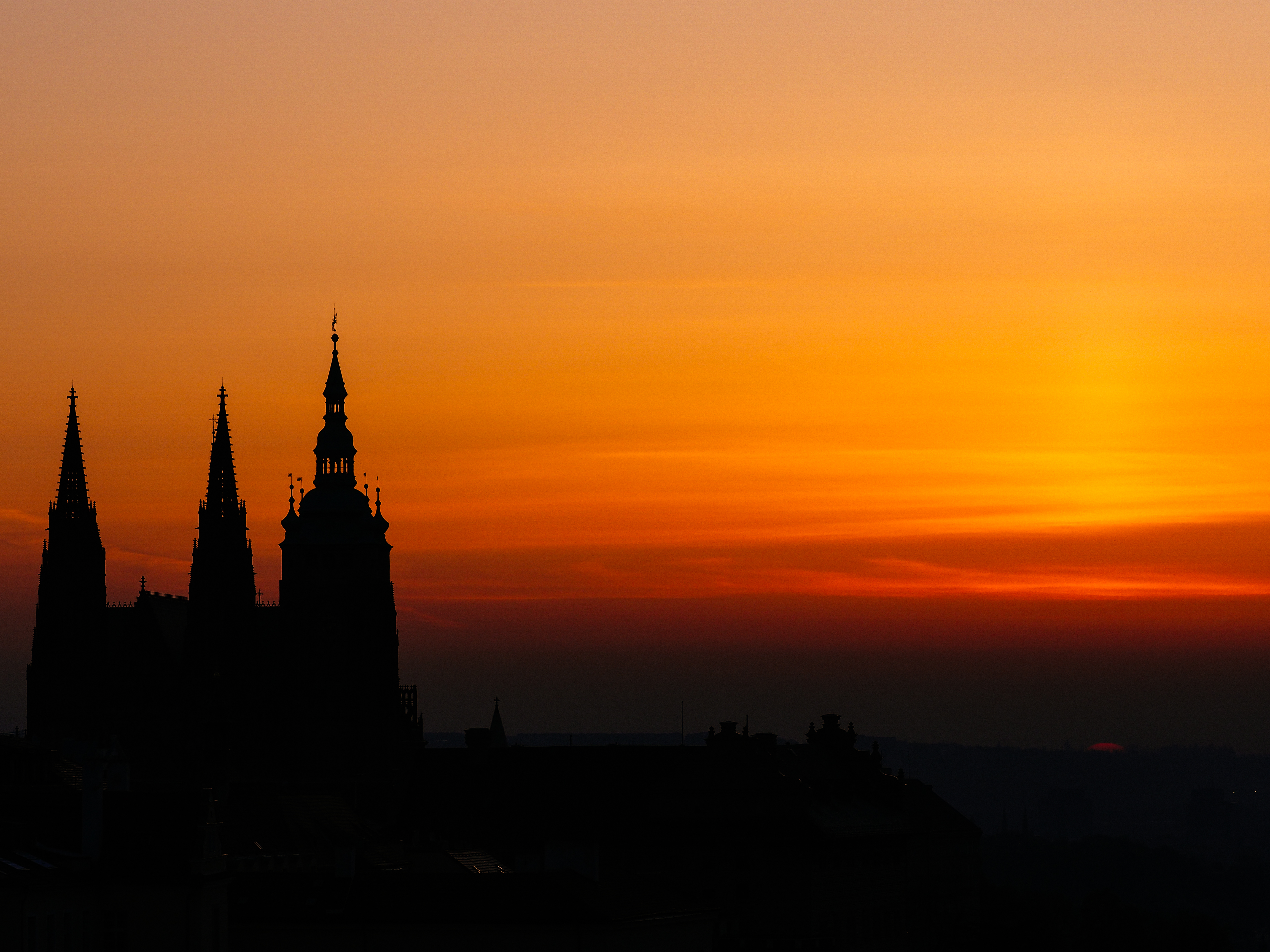 화려한 일몰 속 프라하 성의 실루엣을 담았습니다.
