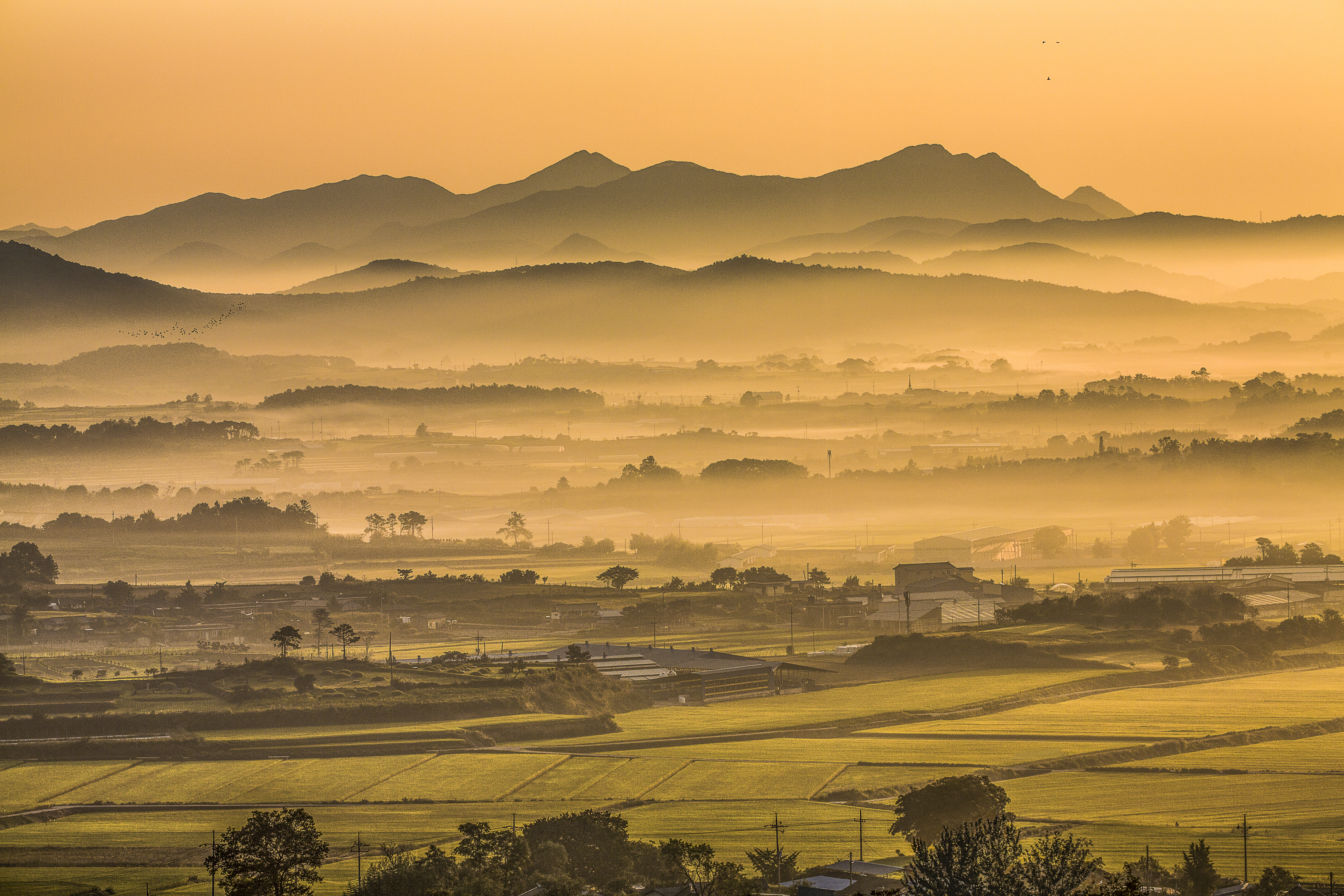 새벽 안개가 구비구비 자욱하게 깔린 밀재의 아침 풍경을 담았습니다.앞 논에는 벼들이 누렇게다 익어가고, 뒷산에는 이름 모를 새들이 날아오릅니다.고요하고 평화로운 농촌의 모습입니다.