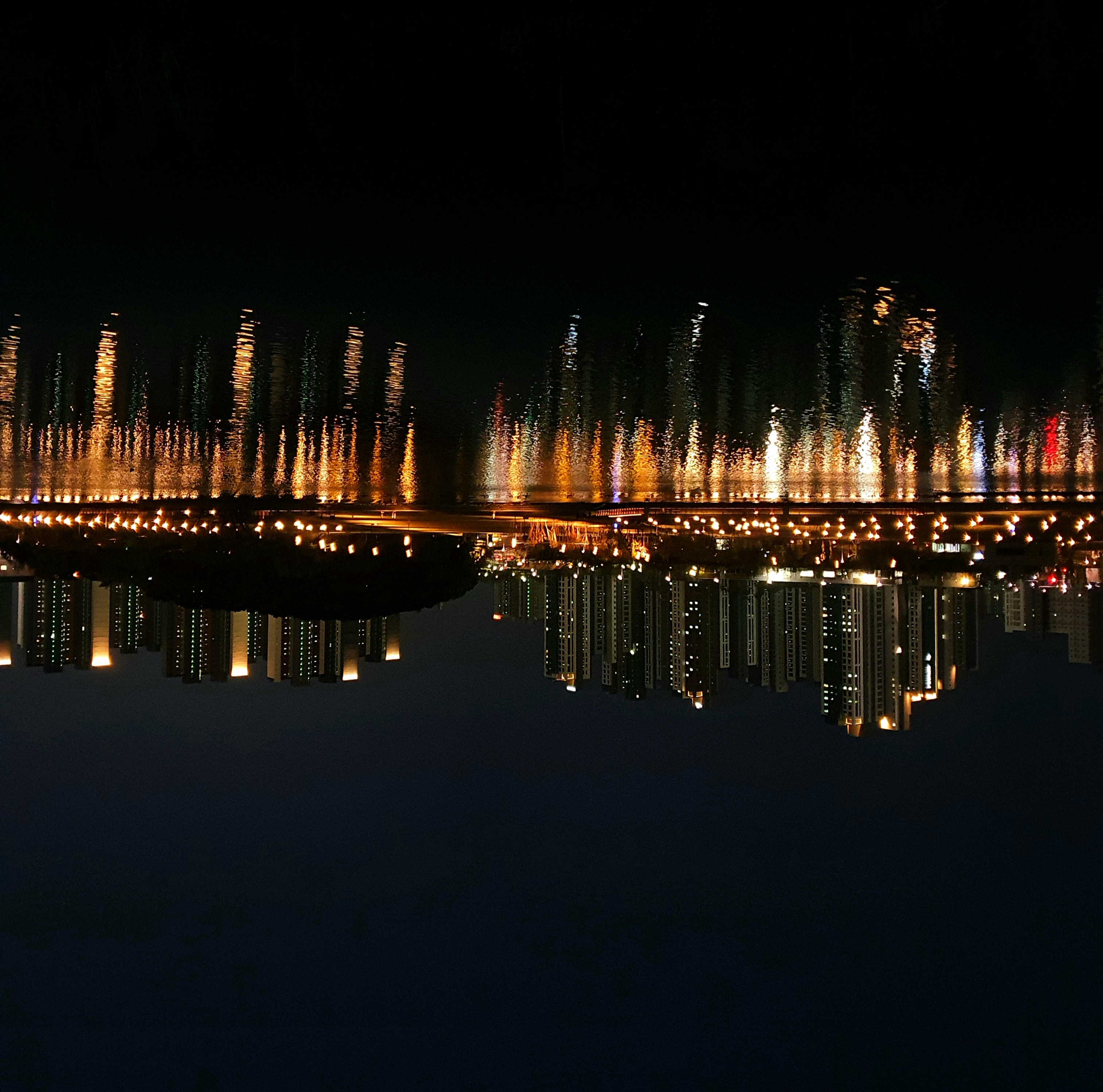 호수에 비친 불빛들이 마치 불꽃놀이 같다