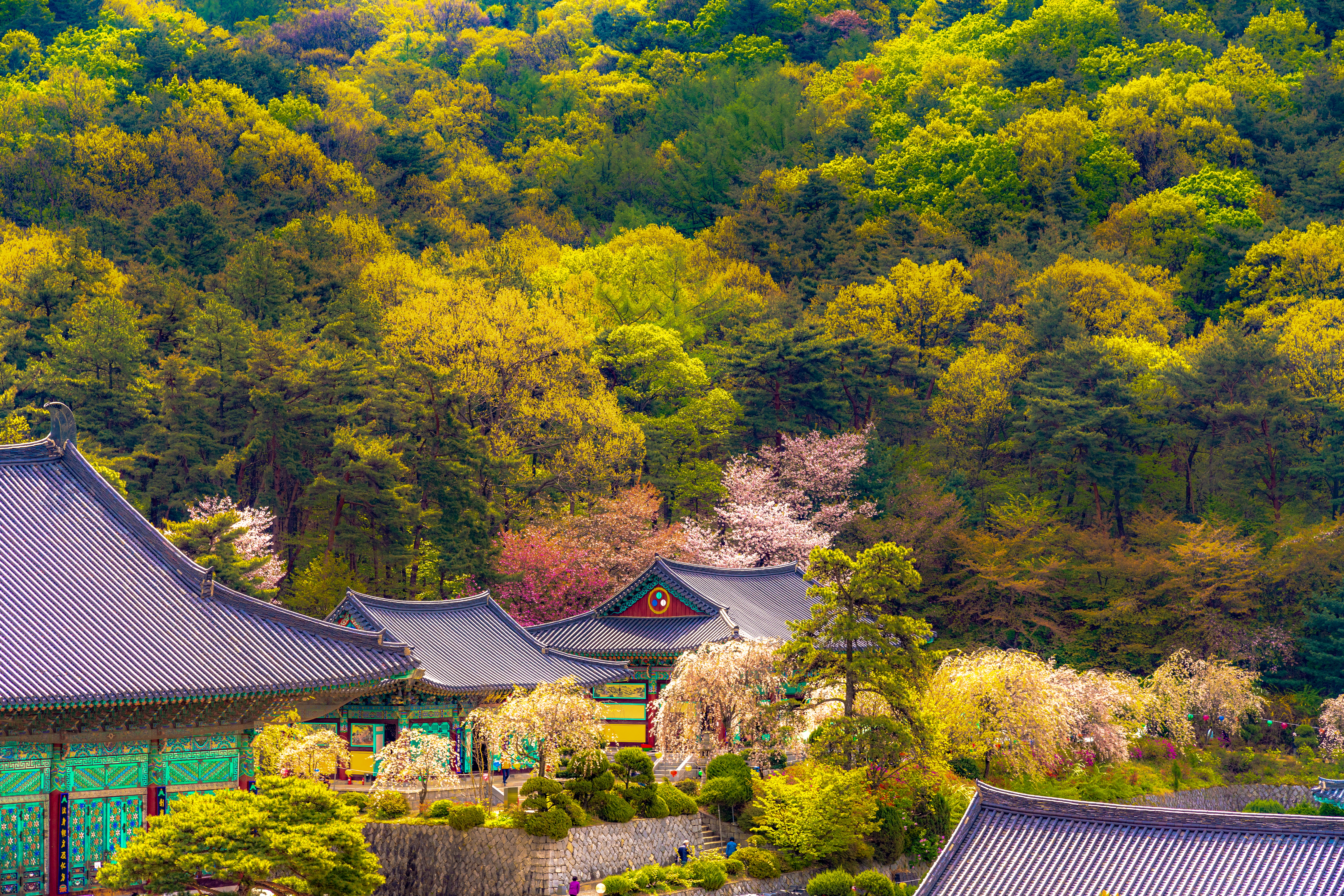 벚꽃과 푸른 나무들로 둘러쌓인 각원사