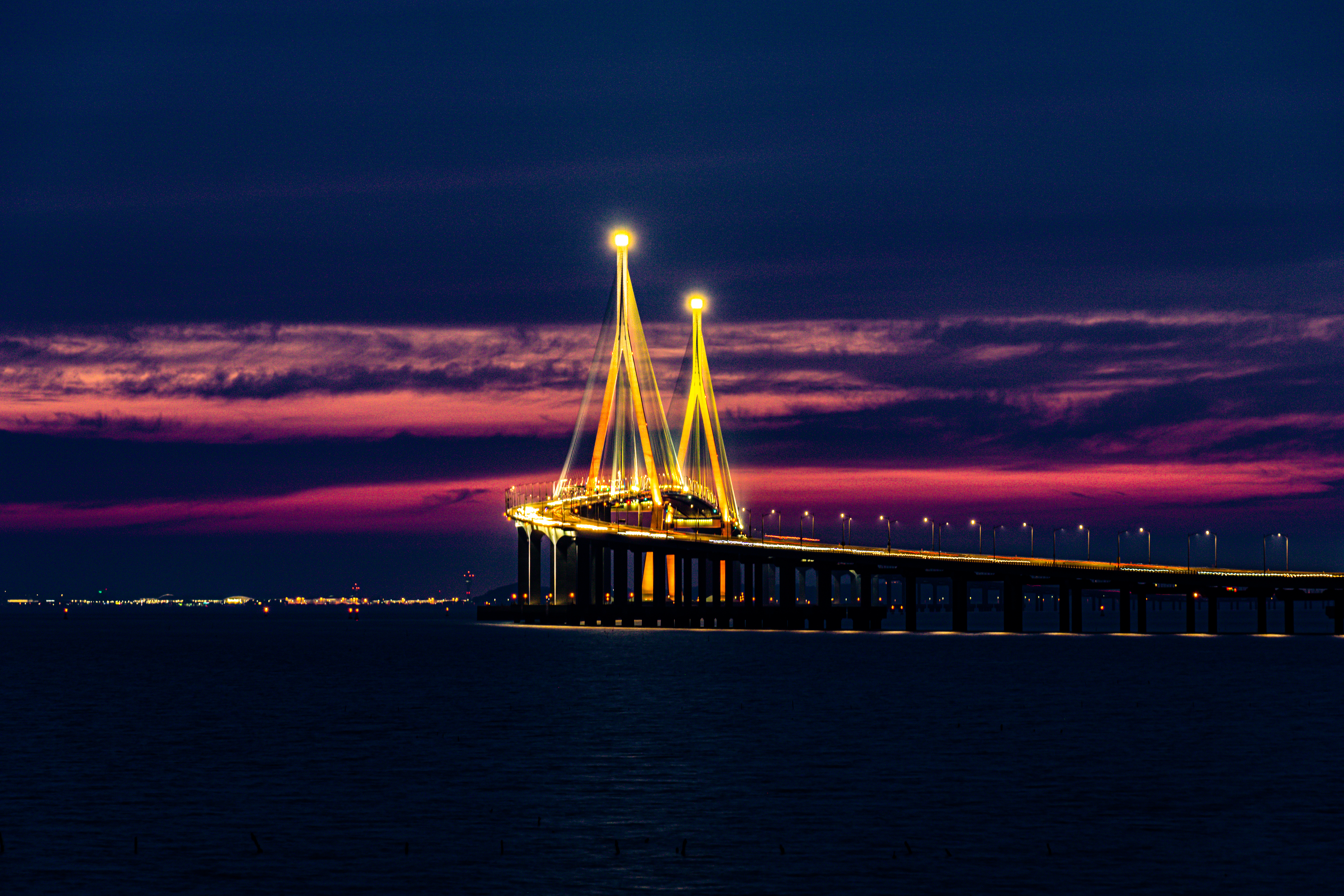 어둠 속에서 황금색으로 빛나는 인천대교