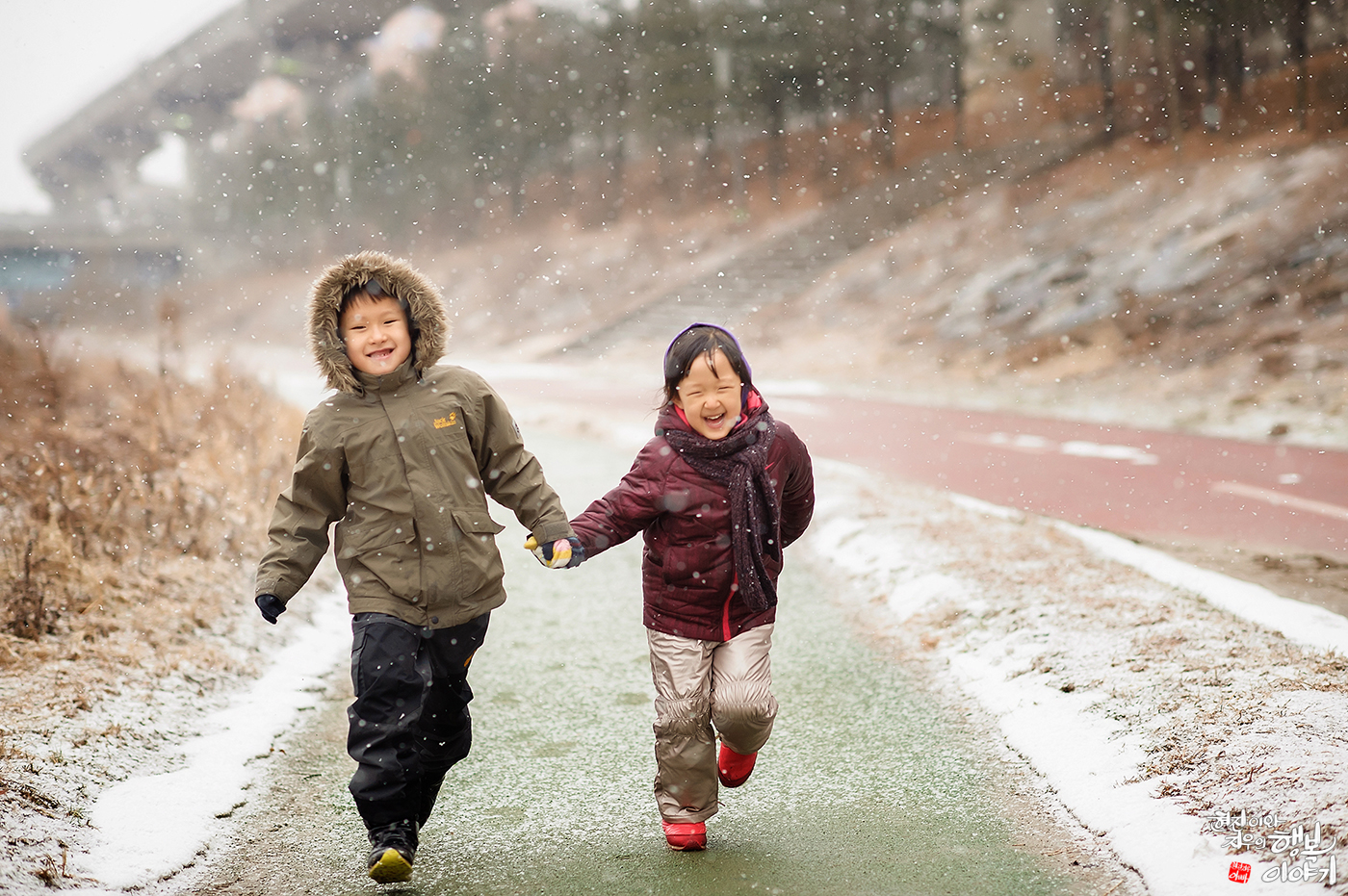 눈이오던 날 동내 산책길 남매가 손잡고 걷는 모습이 이뻐서 아빠는 빠른걸음으로 앞서가 사진 촬영을 시도했습니다. 하지만 남매가 의기투합하여 아빠의 촬영을 방해하기 위해 장난기 가득한 얼굴로 아빠에게 빨르게 뛰어오는 남매를 어렵게 촬영한 사진입니다. 지금처럼만 서로 의지하면서 평생을 함께하길 기원합니다.