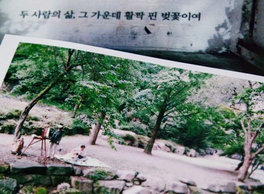 숲을 거닐다 부부 중 한 분은 자연을 벗 삼아 그림을 그리고, 한 분은 기타를 연주하는 모습을 보았습니다. 두 분 모습이 '두 사람의 삶, 그 가운데 활짝 핀 벚꽃'처럼 한 폭의 그림 같았습니다.