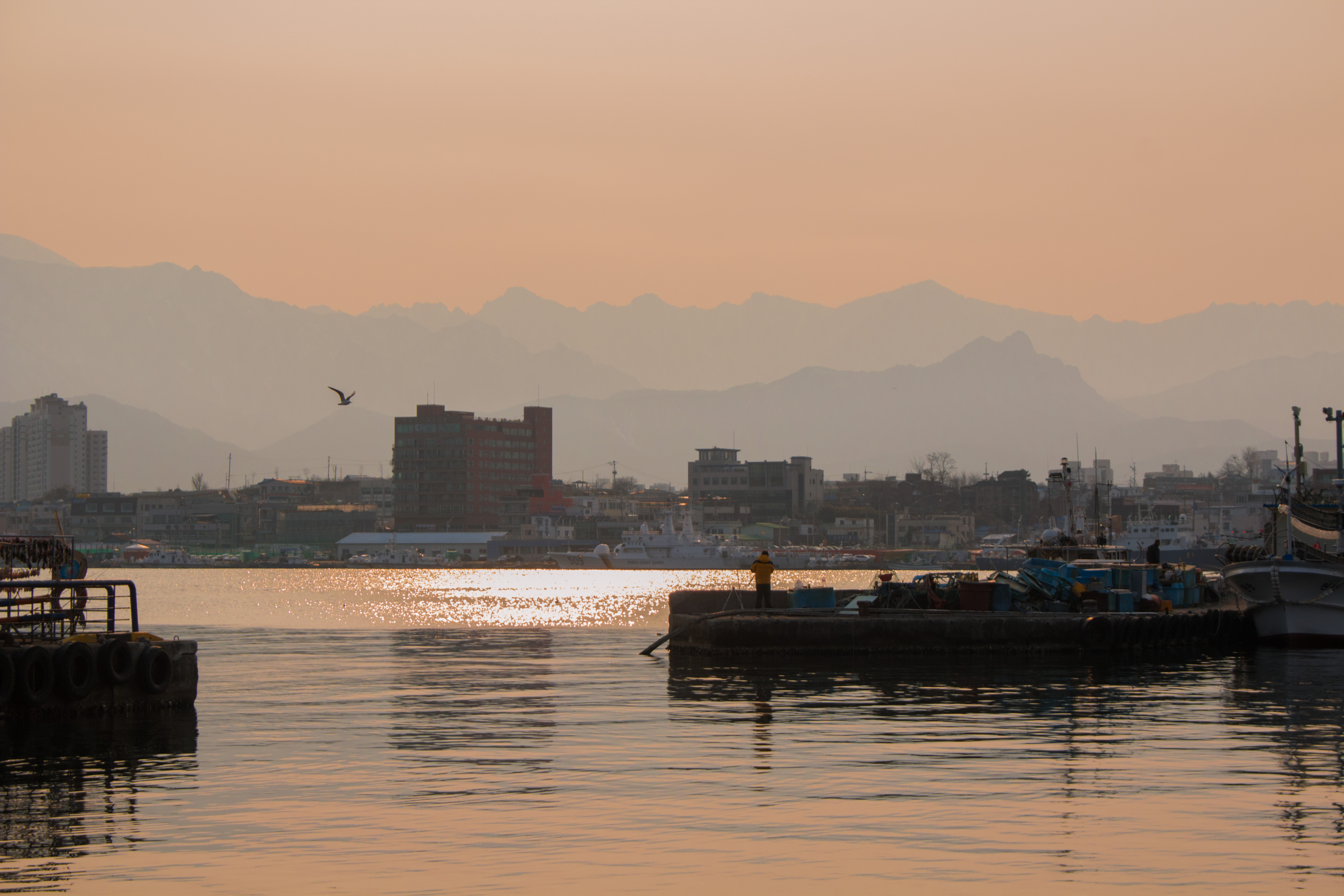 속초 동명항의 노을이다. 드넓게 펼쳐진 바다와 희미하게 겹쳐진 산이 매력적이다