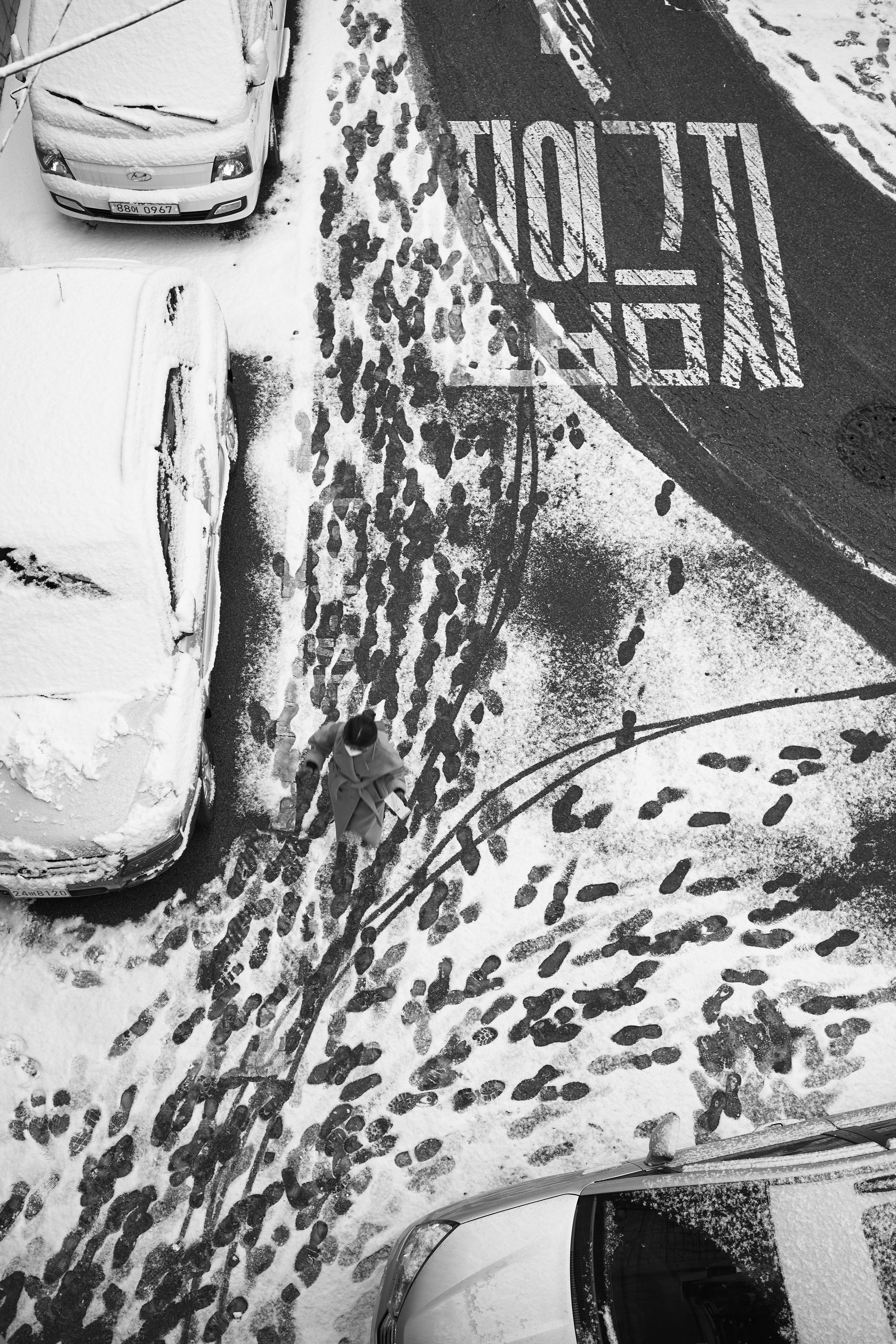 눈 길 위를 지나간 수 많은 발자국들이 하나의 패턴이 되어 시각적 즐거움을 주고 있다.