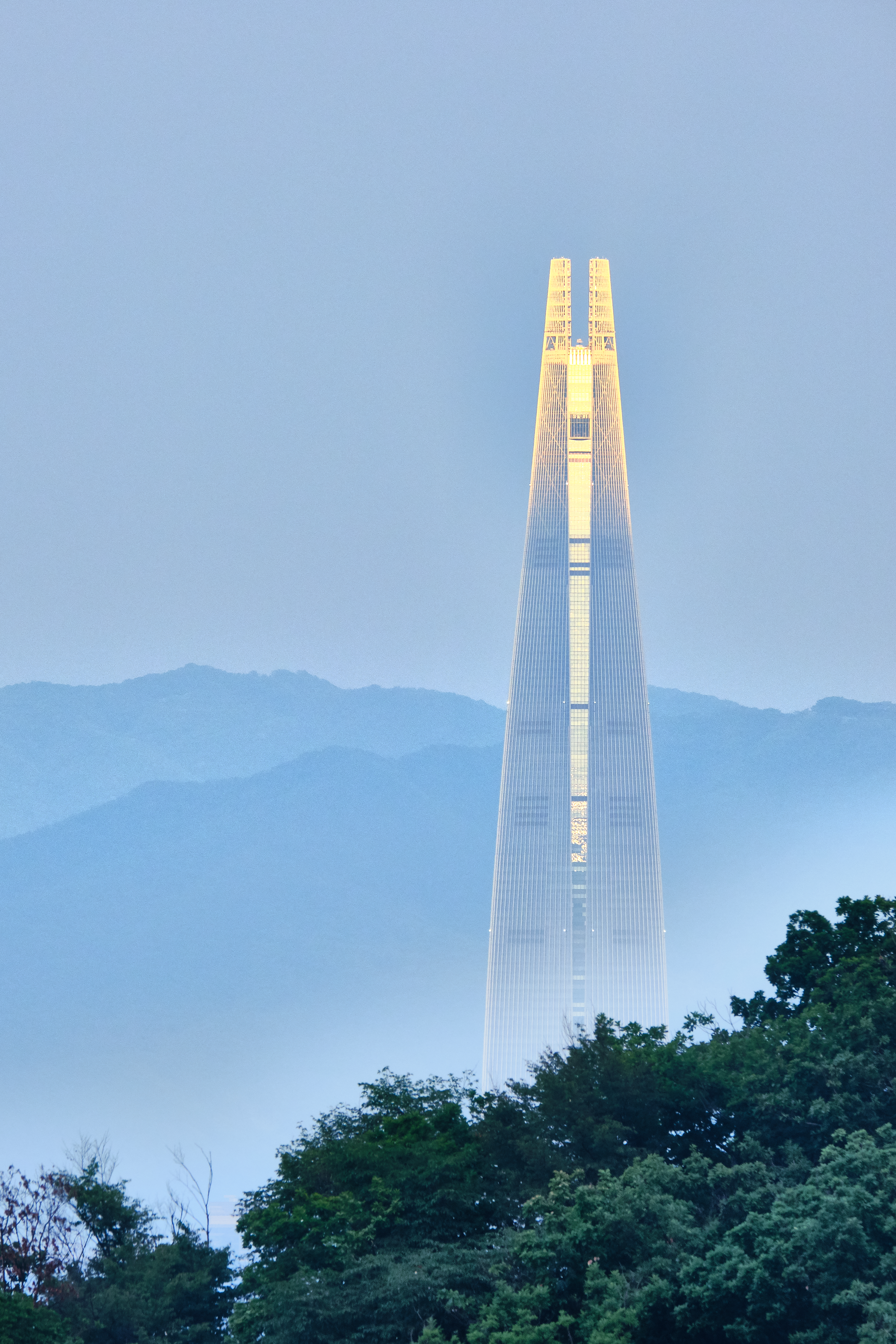 남산에서 망원렌즈를 통해서 본 롯데월드타워가 마치 스포트라이와도 같은 햇빛을 받아서 빛나고있다.
