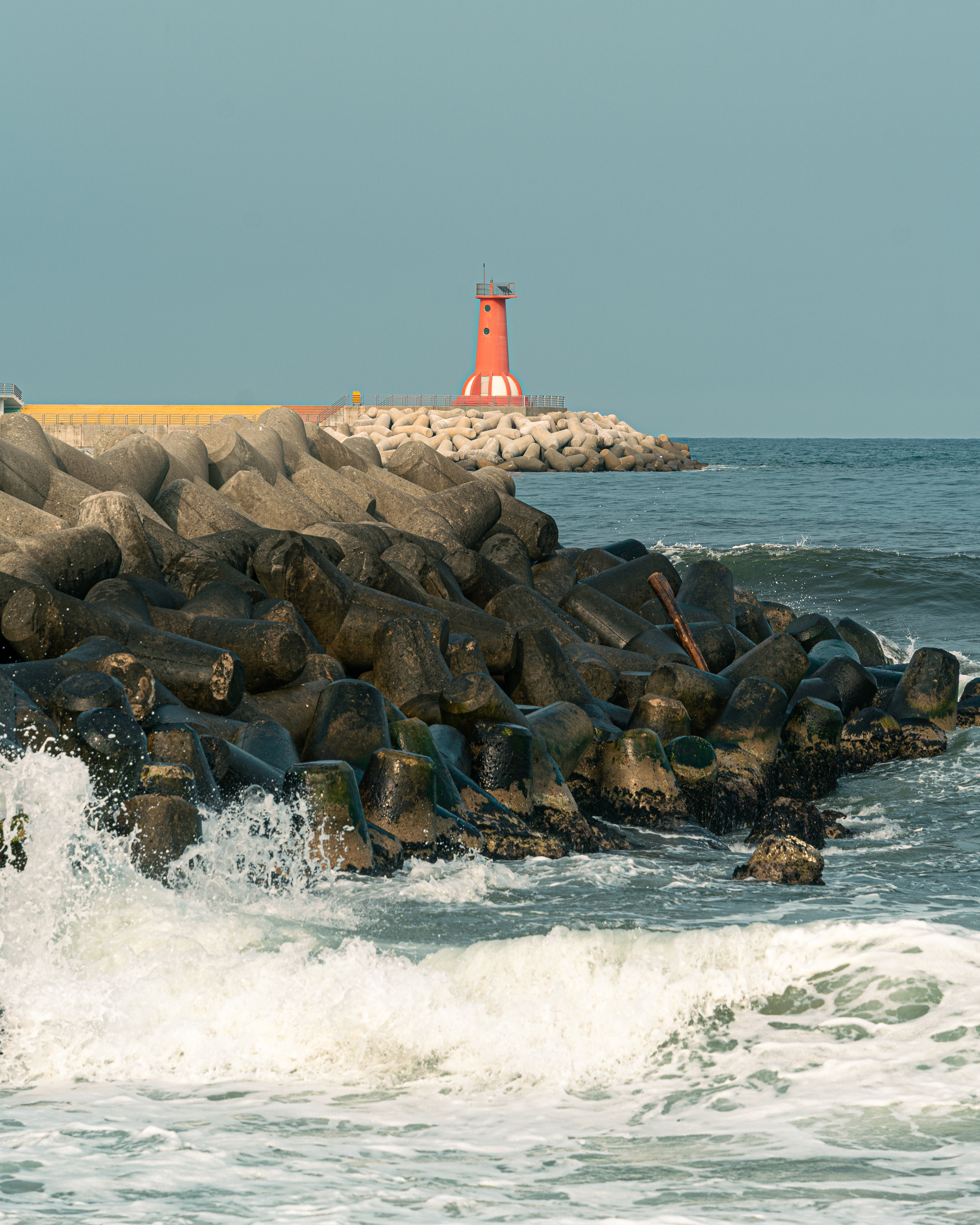 역동적인 파도와 그와 반대로 평화로운 등대