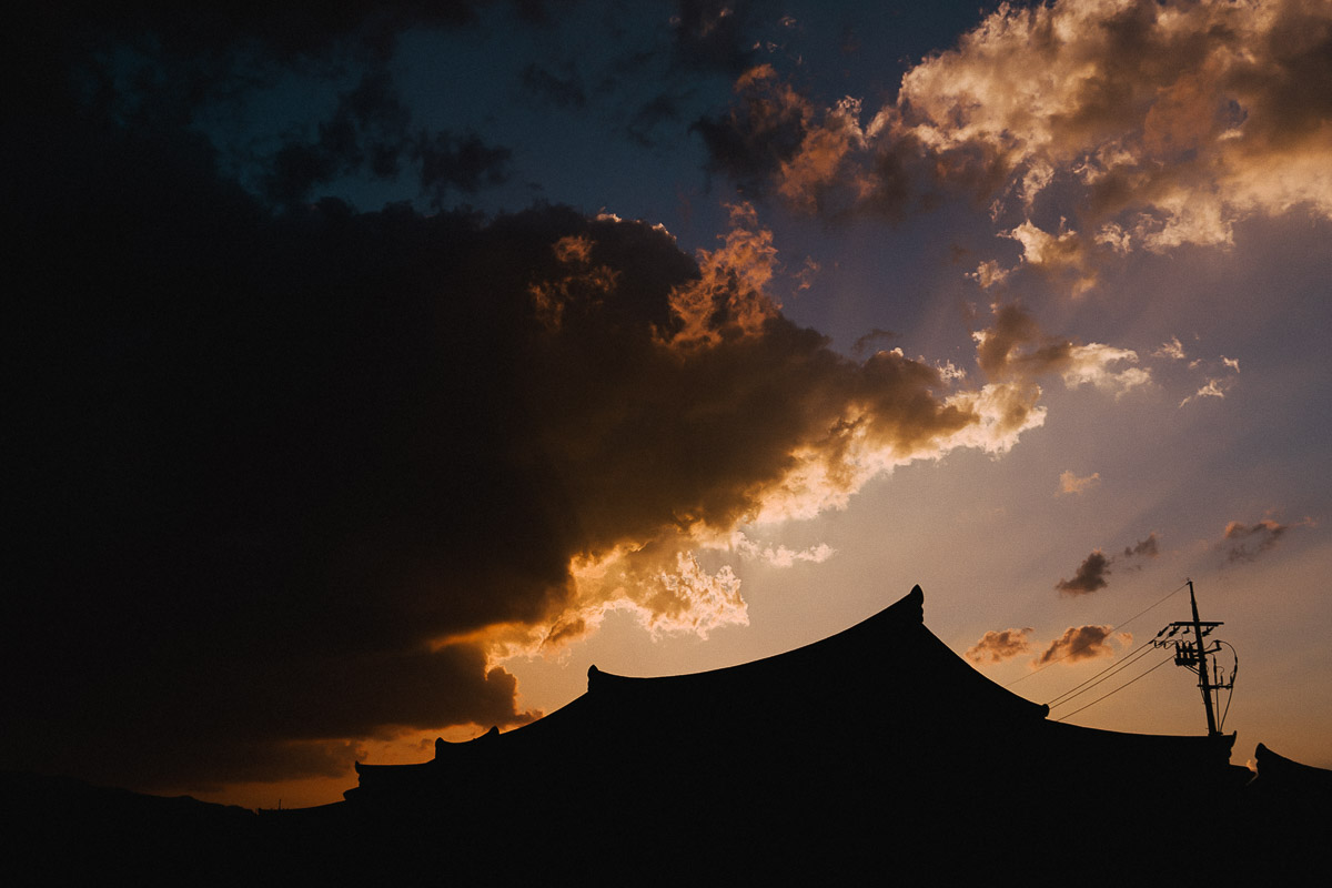 경주의 나지막한 지붕위로 찬란한 노을이 물들때의 모습입니다