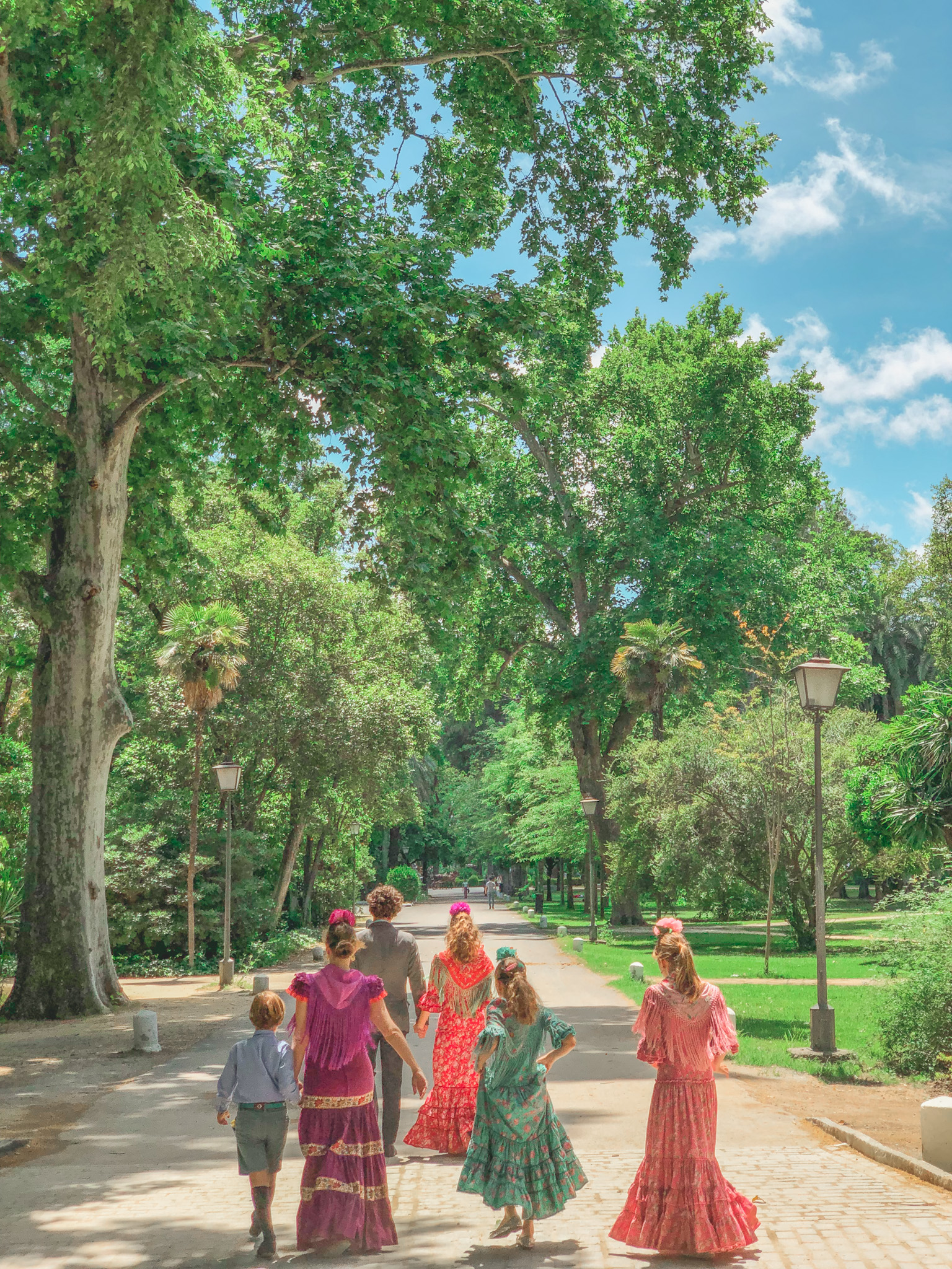 세비야 플라멩고 축제 기간 동안, 춤을 추러 떠나는 가족들의 모습을 담은 사진입니다.