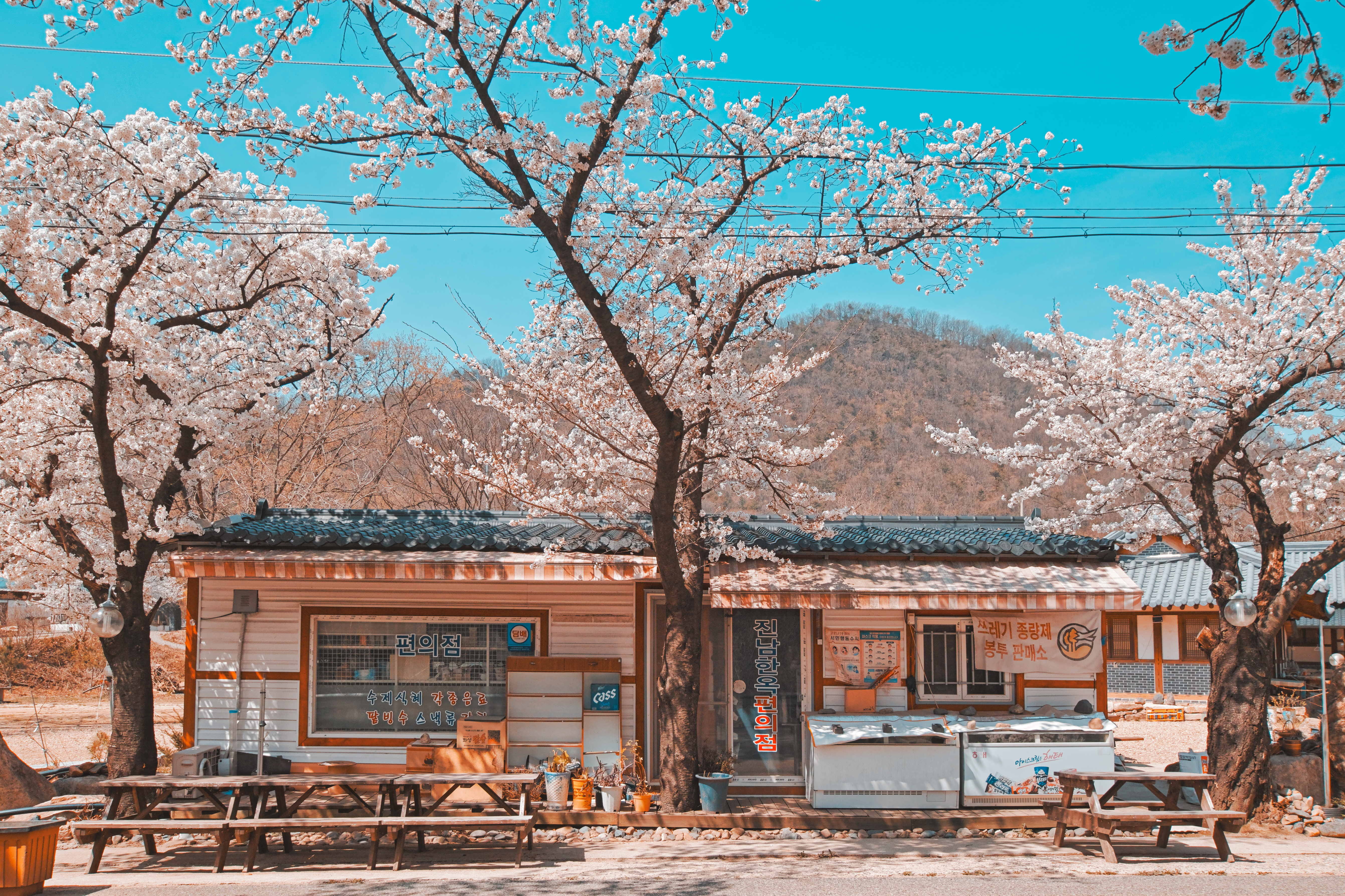 부산까지의 자전거 국토종주 중 만난 벚꽃 아래의 전남한옥편의점