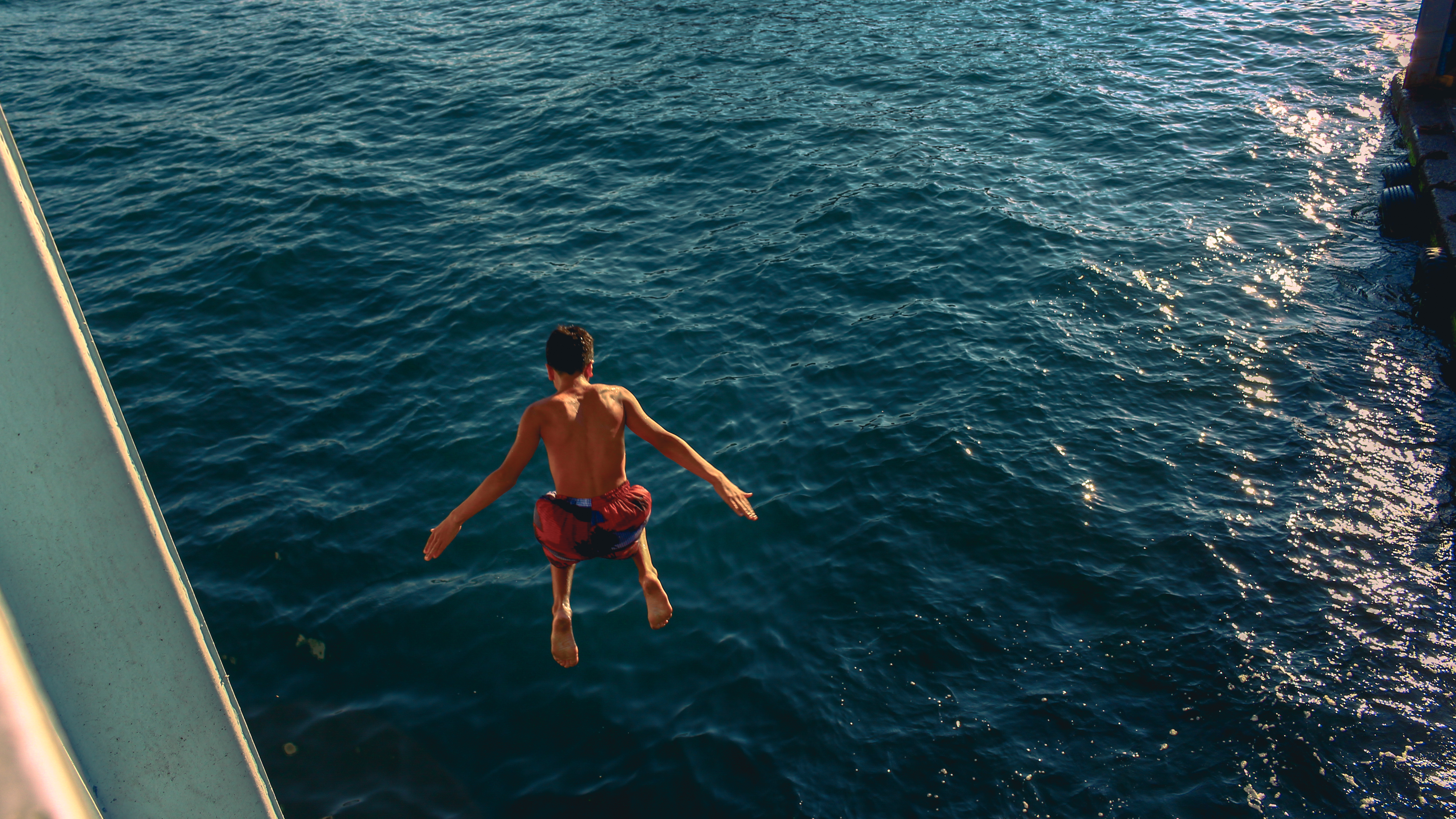 이스탄불 갈라타다리 위에서 다이빙하는 소년