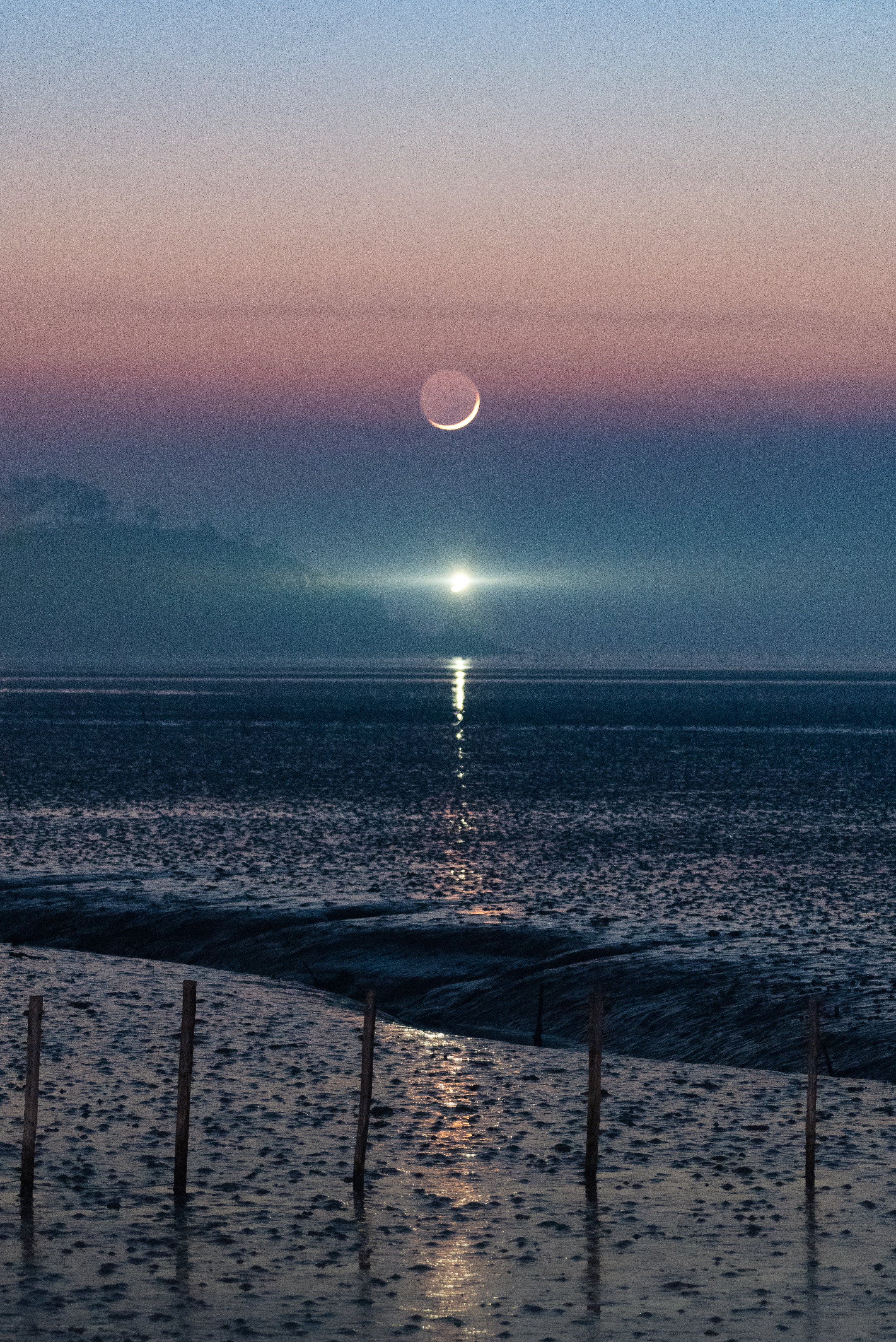 여명이 남은 대지 위에 달이 저물고 있습니다