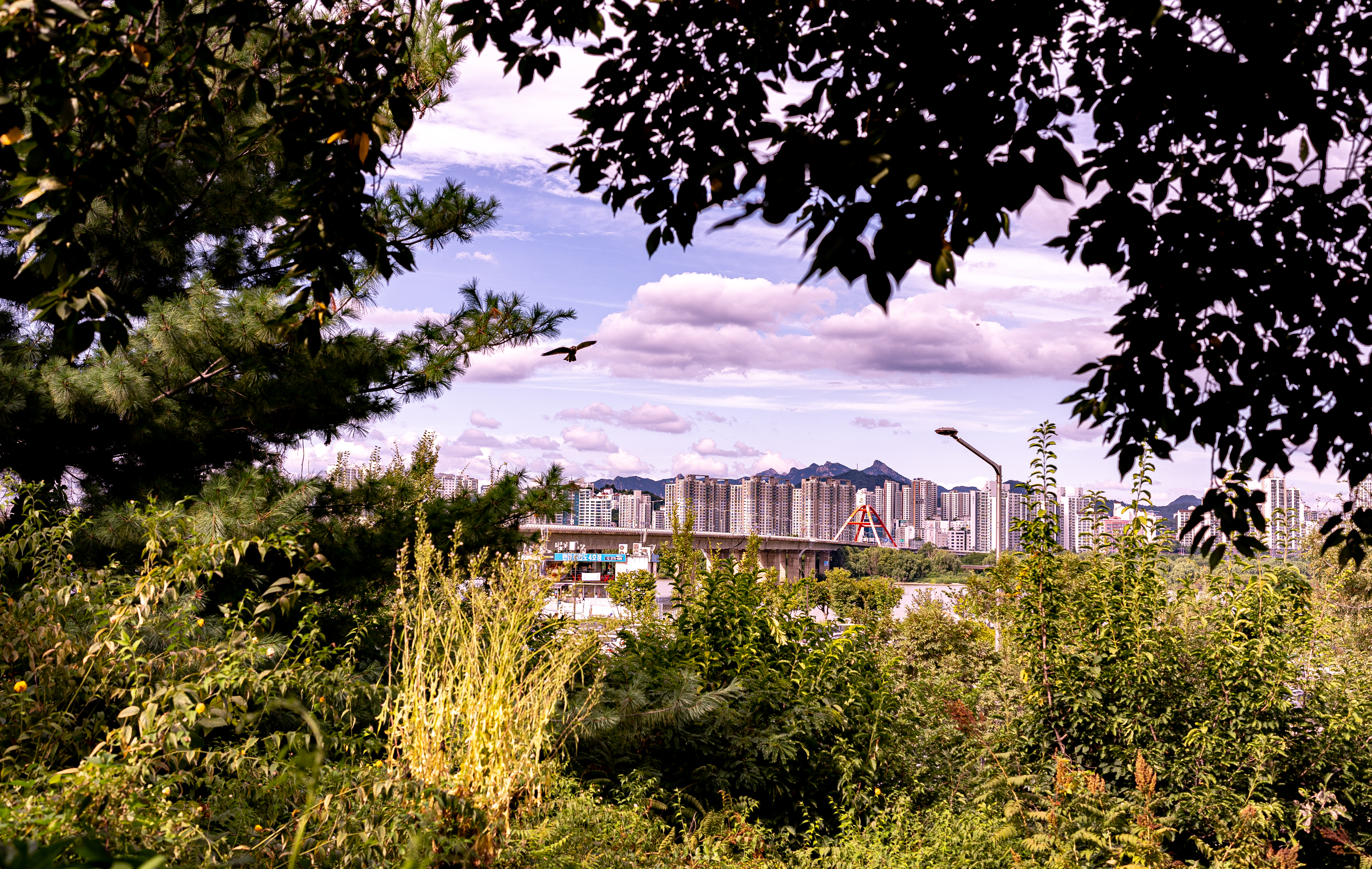 우거진 초목이 하나의 프레임이되서 도시를 보여주는