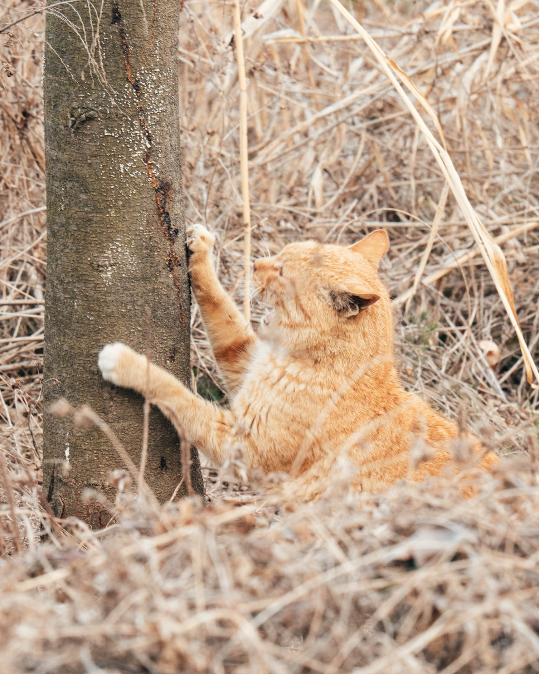 나무를 긁고 있는 고양이